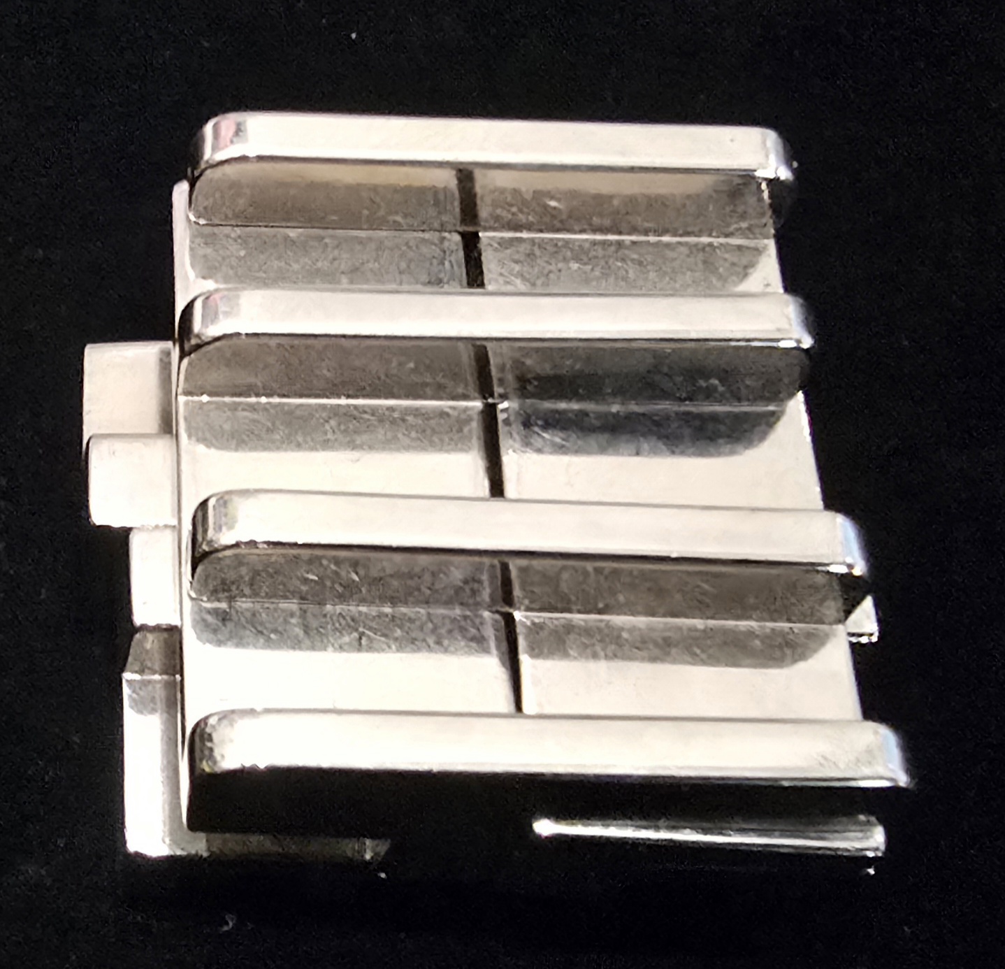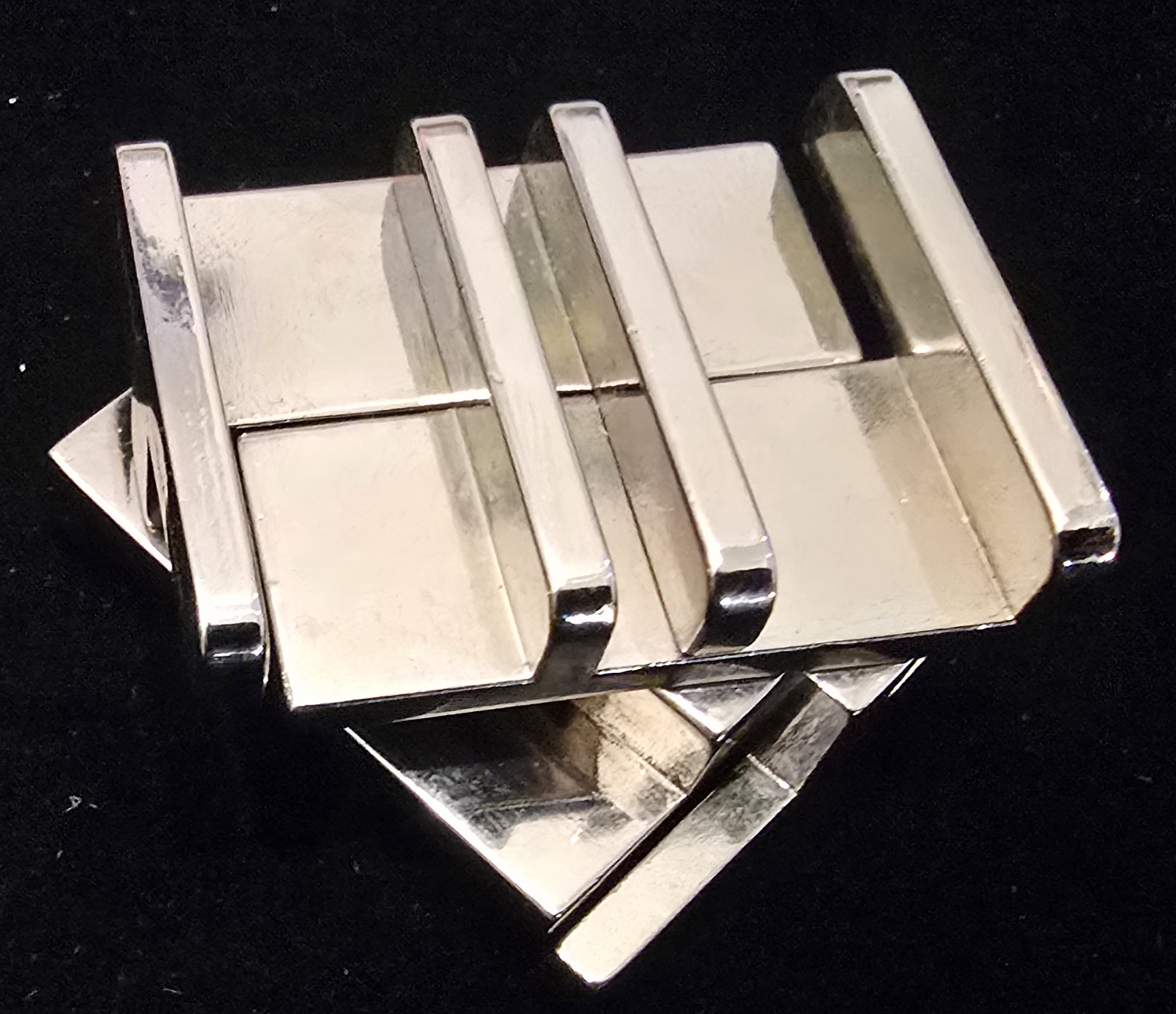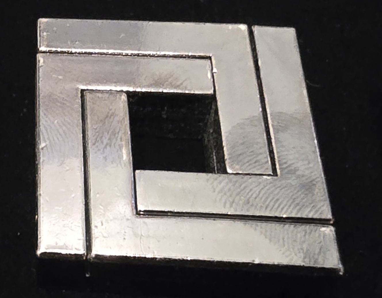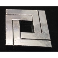 • ​Cast Square: A sleek, geometric puzzle designed by Vesa Timonen. The objective is to disassemble the four interlocking pieces and reassemble them. (Level 3/6).