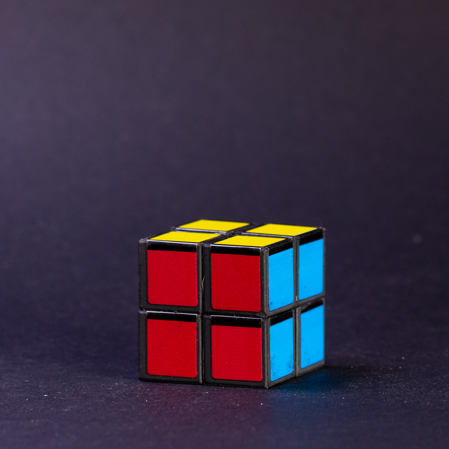 Each cube has different colored sides and the goal is to find the right combination so that the 2x2x2 cube has only one color on each side.