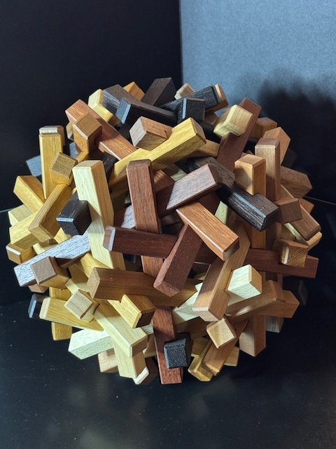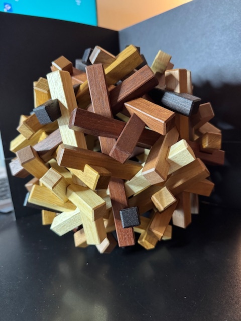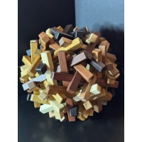 The Magnus 60 is a complex, spherical, 60-piece wooden burr puzzle designed by Junichi Yananose (Juno) of Pluredro. Inspired by Father Magnus J. Wenninger, this intricate puzzle features interlocking, notched sticks and is constructed from six different types of wood, making it a challenging, high-end mechanical brain teaser.
