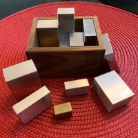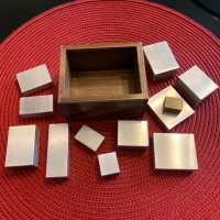 Crafting Melting Block 4 requires extreme precision to prevent unwanted false solutions. Each CNC-machined and hand-finished block is accurate to 0.002 inches. The wood box is precisely crafted to a perfect fit. The result is excellent, weighing in at a hefty 1.75lbs. The bright, clean character of the pieces contrasts nicely with the dark warmth of the wood.