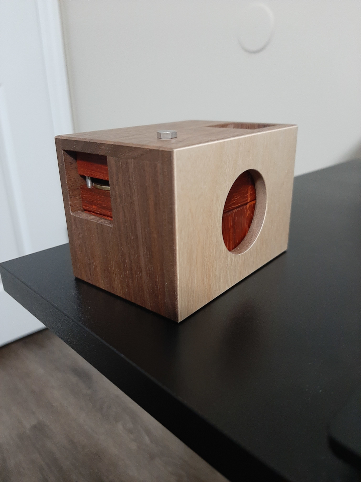 This is an incredible and beautiful puzzle that's packed with puzzling goodness. I spent several hours on it over the course of several days. So many cool and surprising mechs with lots of great aha moments! It's a big step up from Jammed Gem, which was already very impressive. It was produced in very limited numbers for IPP42 in Tokyo. Hence the Maple side with circle hole and red pieces to represent the flag. I had an absolute blast with it and ready to pass it on to fund the next adventure!
