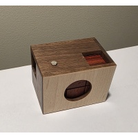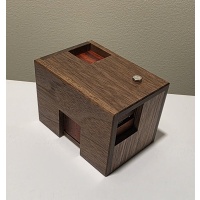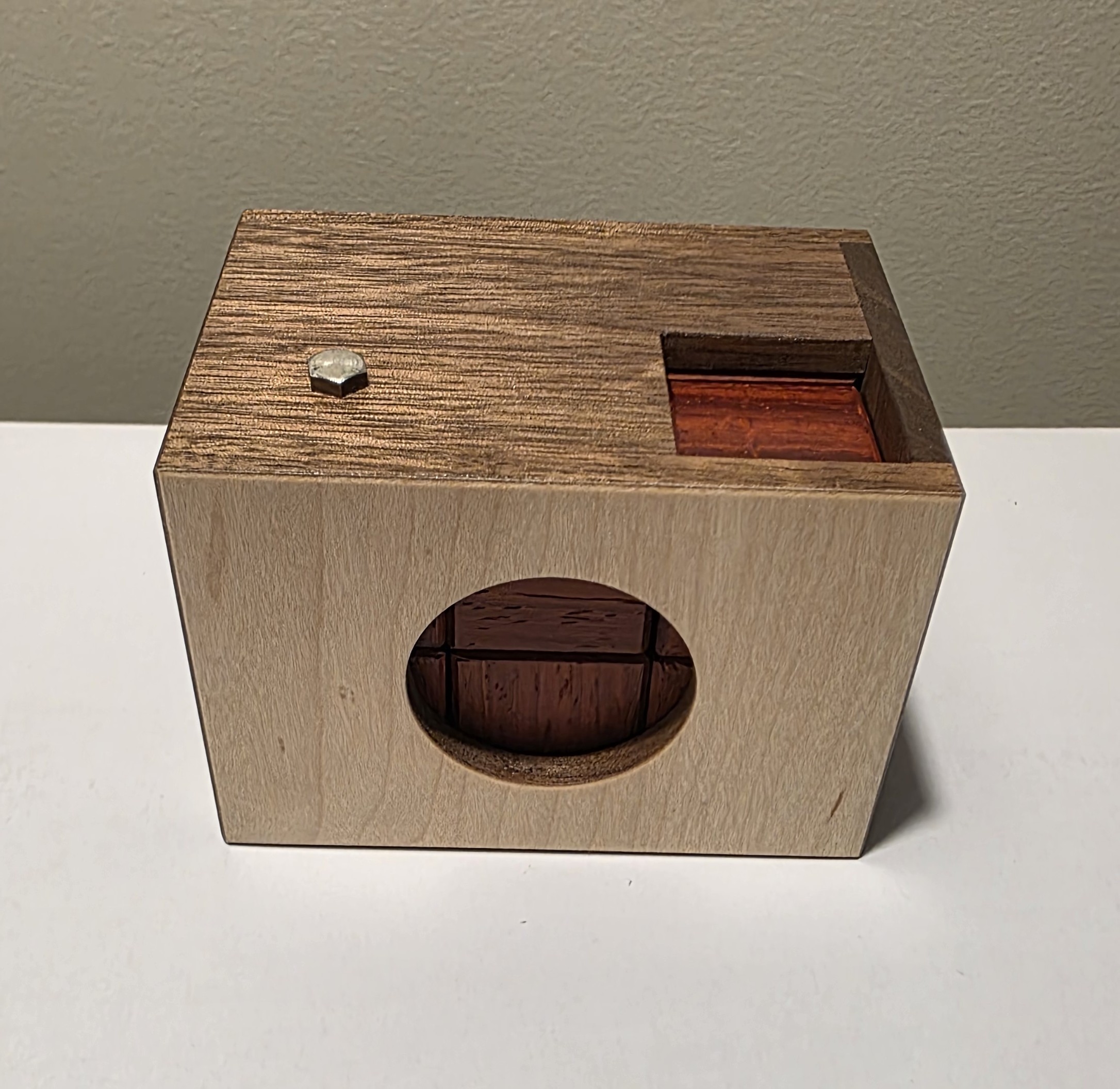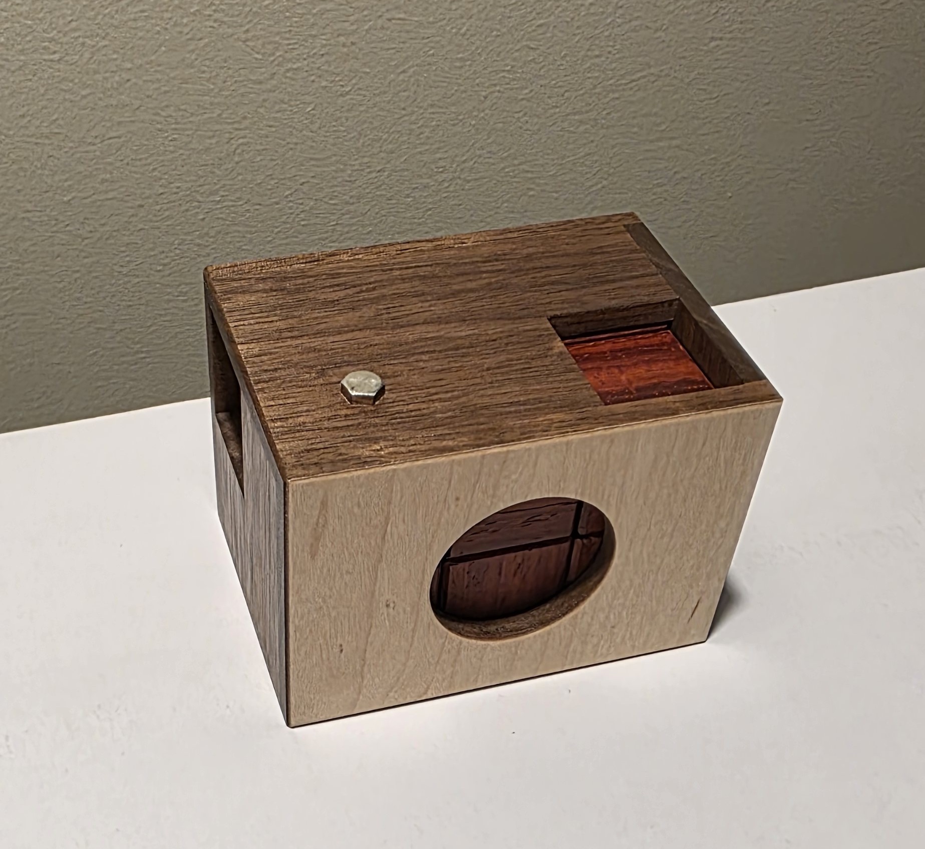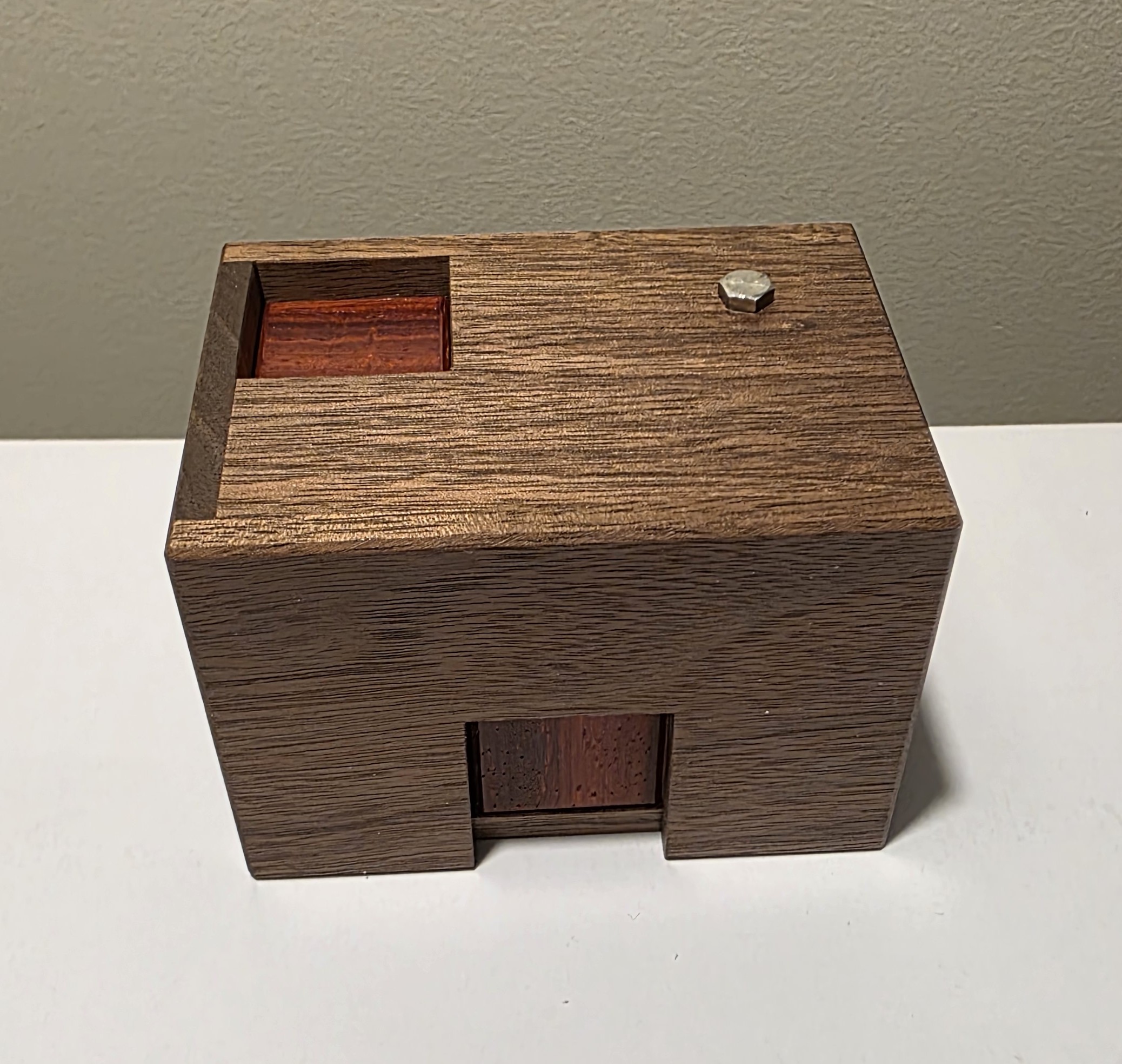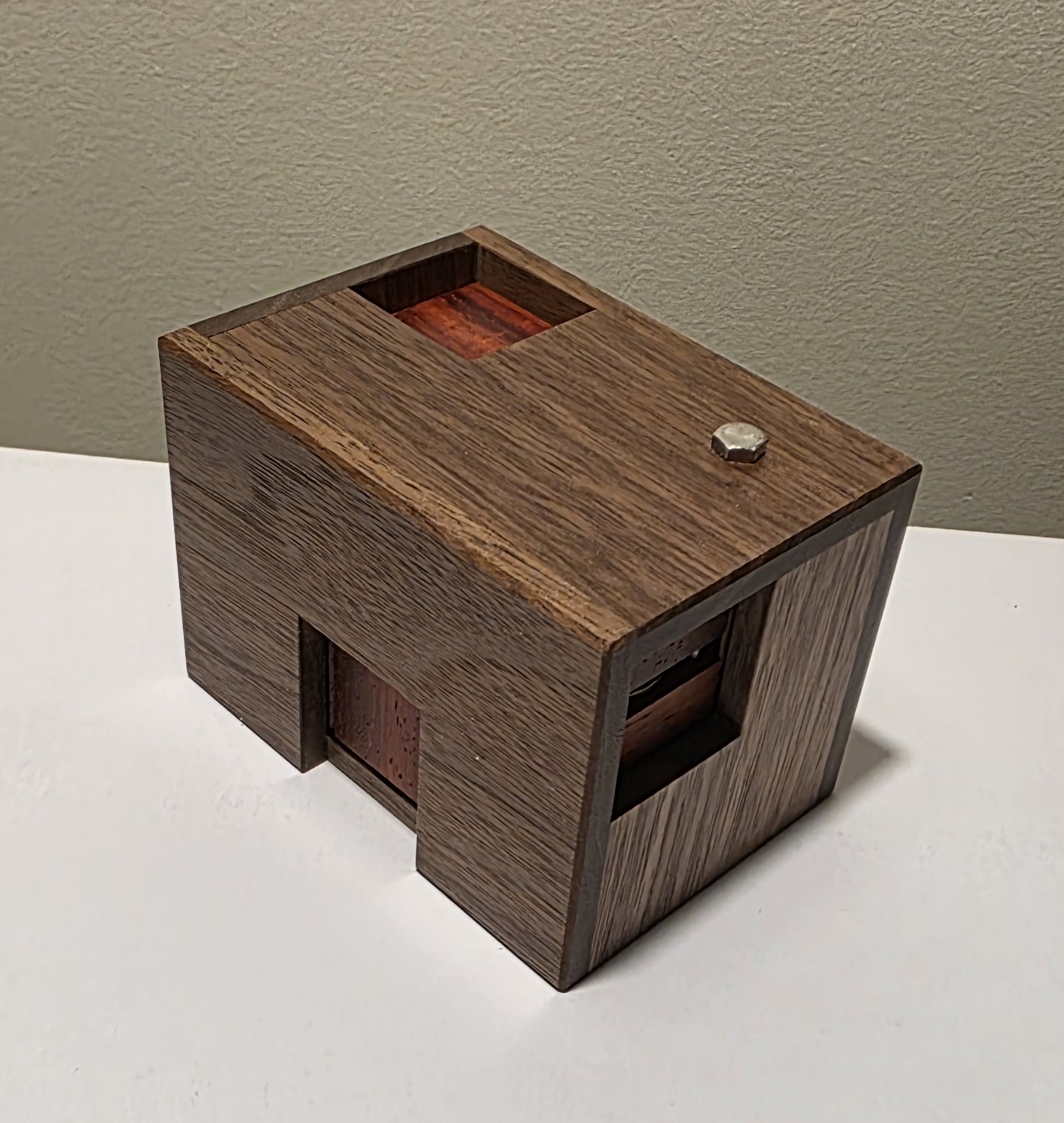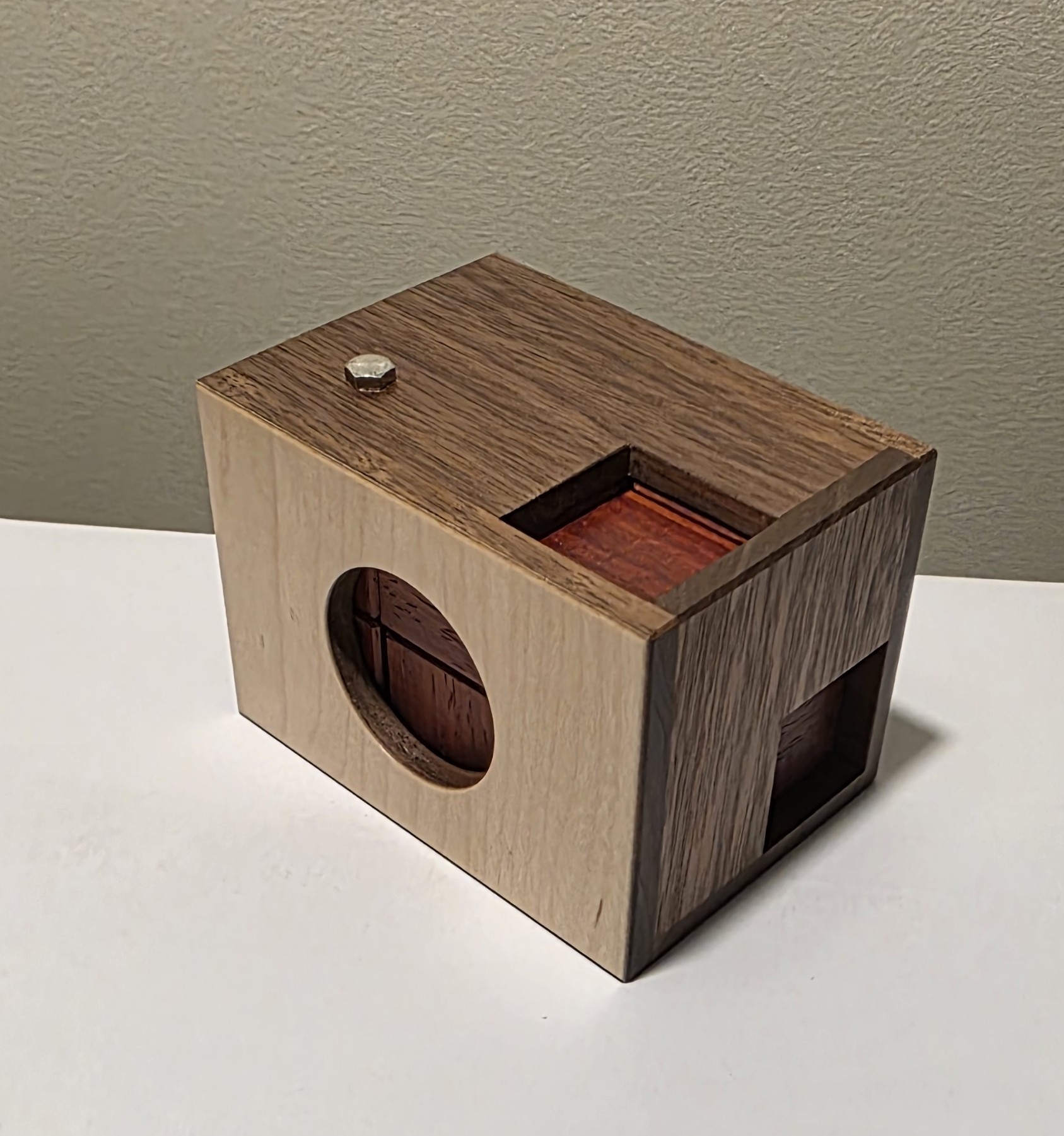 This beautiful puzzle is made from walnut, padauk, maple, and magic.