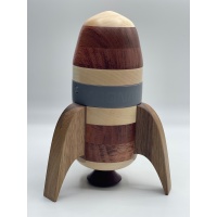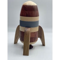 Moonage M5 is a sequential discovery, take apart puzzle. The goal is to find the spaceman, the moon lander and the flag. Size is 19cm high, body diameter 7,5cm, with fins diameter 15cm. About 500g. Used wood: Maple, Walnut, Amarant, Used materials: Wood, acrylic glass, magnets, metal parts, pla,... No force needed, no banging!