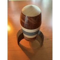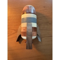 "Moonage M5 is a sequential discovery, take apart puzzle. The goal is to find the spaceman, the moon lander and the flag. Size is 19cm high, body diameter 7,5cm, with fins diameter 15cm. About 500g. Used wood: Maple, Walnut, Amarant, Used materials: Wood, acrylic glass, magnets, metal parts, pla,... No force needed, no banging!"