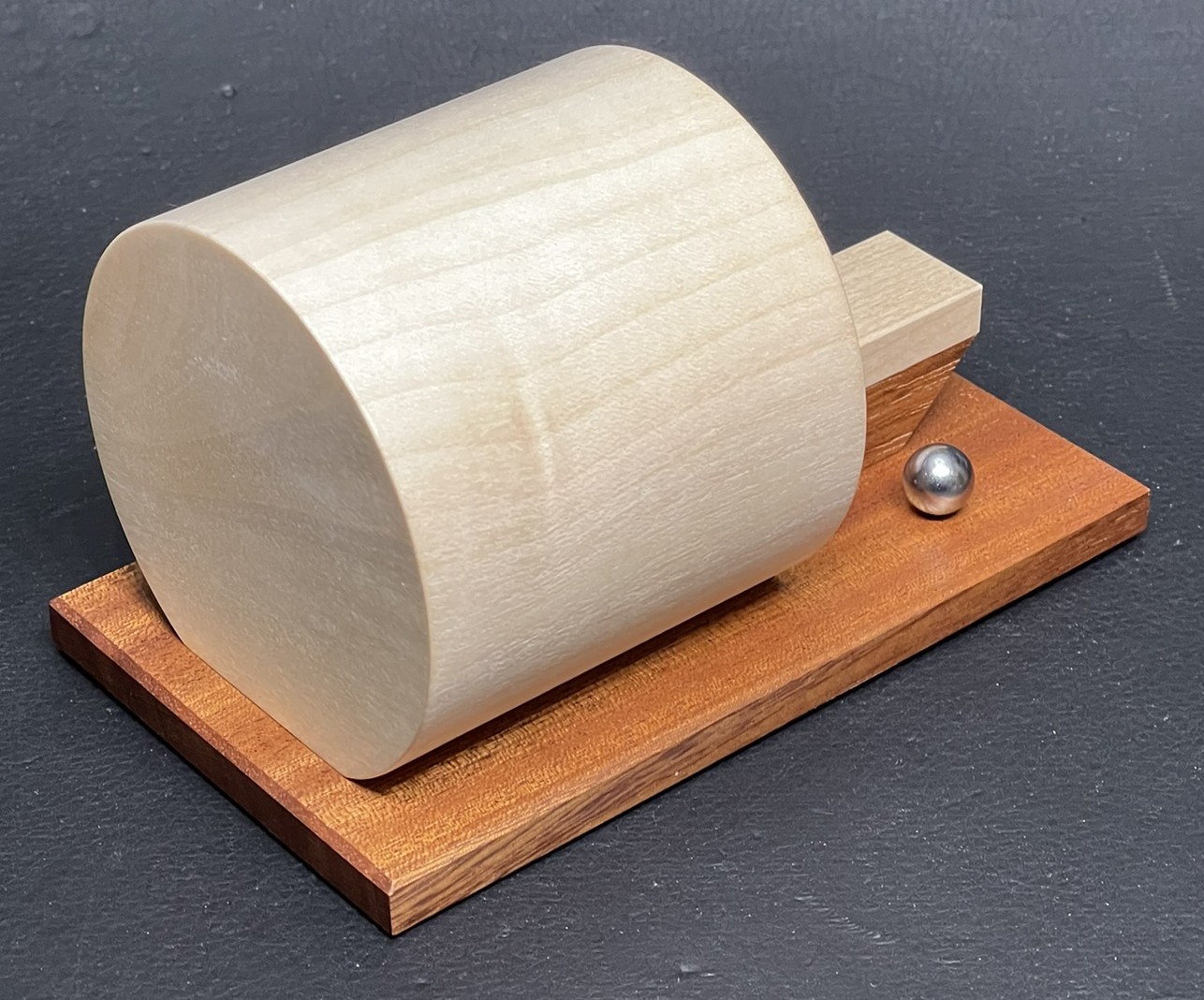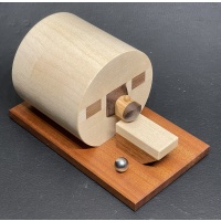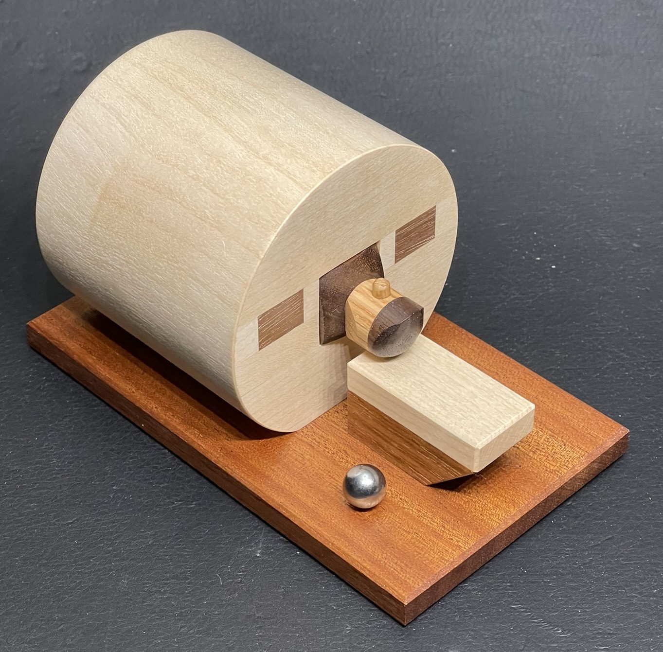 “This new rather quirky and very attractive puzzle design by Benjamin Heidt is a new type of puzzle for Pelikan and I am not certain how to categorise it. Apparently Benjamin is a technician who works on MRI machines in hospitals. He must be very used to working with magnets and there are several of them inside this puzzle. It looks just like an MRI scanner complete with a patient (he has hair and a nose!) on the scanning platform inside the magnet. The aim is to remove the patient from the scanner by unlocking the hidden interior mechanism. One thing Benjamin should know is that you must NEVER bring another ferrous metal object inside the Faraday cage walls of an MRI room because it will turn into a missile if released in the room (believe me, I have seen it with an old Molybdenum steel oxygen cylinder – it moves very fast and does a LOT of damage!) but here he has disobeyed all the rules. The puzzle has a magnetic ball bearing on the floor held by a magnet embedded inside it and obviously this magnetic bearing is used to somehow unlock the patient from the scanner and remove him. I do not know how many steps is required because I have so far not managed to do much more than make interesting clicking noises as I move the bearing over the surface. I am making things happen inside but so far I have made no progress with the release – my patient may well starve to death in the MRI! I may be reduced to having to take it to work and asking a kind radiographer to take an Xray of it for me. This is certainly something interesting which we have never seen before from the Pelikan workshop. Well worth adding to your collection for the quirkiness and the considerable puzzling challenge.”