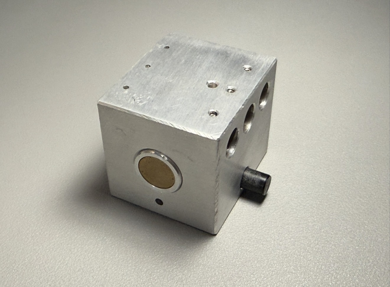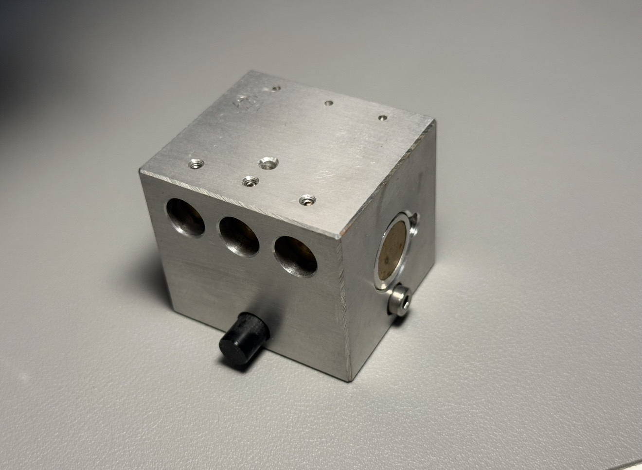 This version of the puzzle lacks the black anodisation that the finished copy received - as well as having slightly different mechanisms to ‘free the orb’ from the puzzle.
