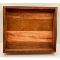 Tray is made from Peruvian Walnut with Yellowheart Slipfeathers.  Bottom is segmented Red Zebrawood and Peruvian Walnut (see note below).