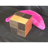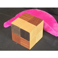 The puzzle is a beautiful example of craftsmanship, constructed from what appears to be four different types of wood, meticulously arranged to form a two-by-two cube. Each of the four sides presents a distinct and elegant checkered pattern. The goal is to disassemble the puzzle and then reassemble it back into its perfect cube form, a deceptively difficult task that will challenge and delight.