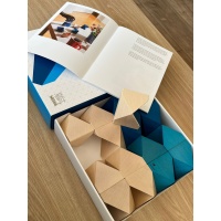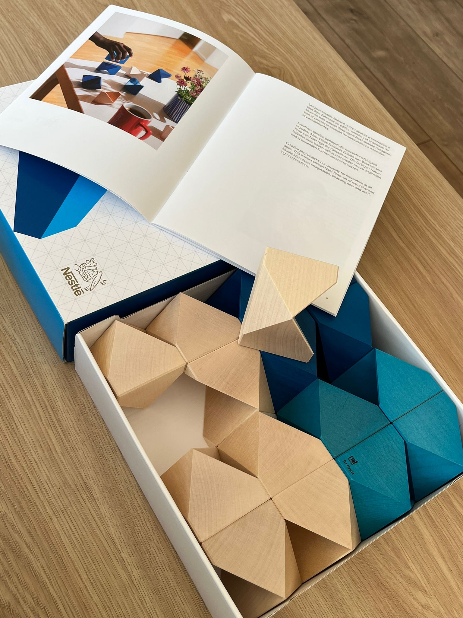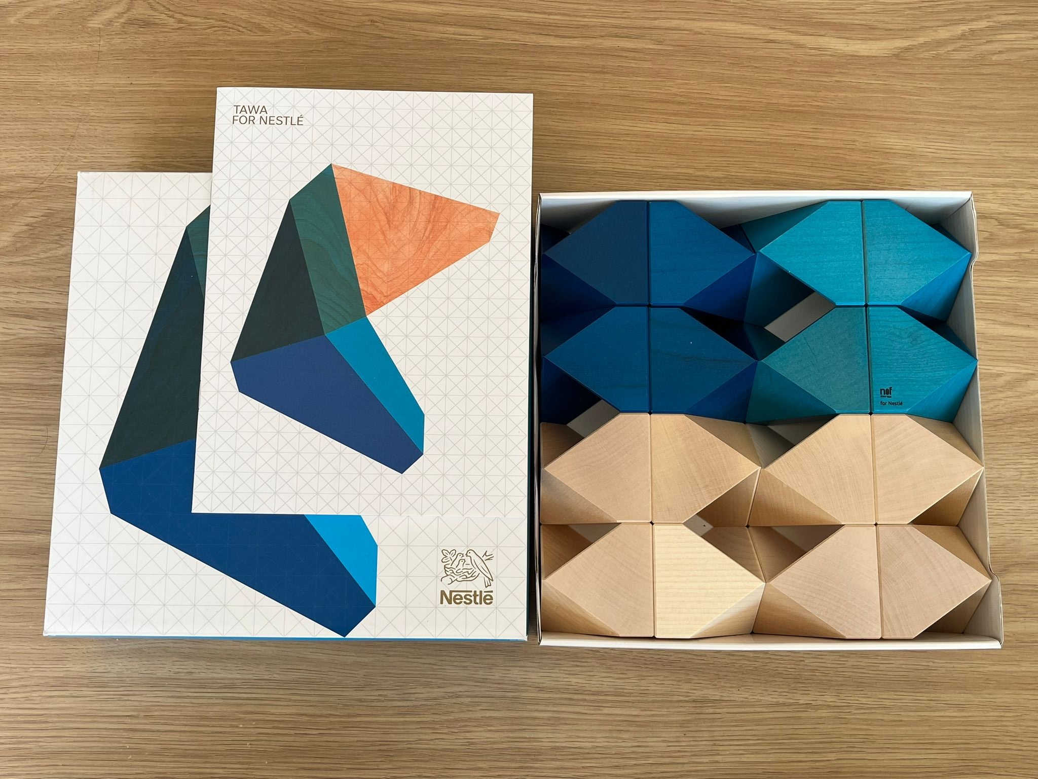 The Tawa set consists of 16 precisely crafted building blocks made of high-quality maple wood, manufactured exclusively in Germany. The wood comes from Baden-Württemberg and bears the PEFC label, which guarantees sustainable forestry. Each building block is carefully milled, sanded and tested before it completes the final set. Eight of the cubes remain unpainted, while the others shine in two shades of blue – colors that perfectly match Nestlé’s corporate design.
