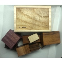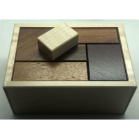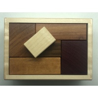 "New Melting Block by John Rausch is an improved version of Tom Obeirne's original Melting Block puzzle. This paradoxical 3-D packing puzzle has two unique assemblies, one using seven pieces and the other using all eight. There are two possible solutions for each assembly. The seven-piece solution seems to fill the box entirely, with little room to spare. The leftover block seems far too large to fit in the box...yet somehow, impossibly, the eighth piece does fit when the second solution is discovered. NMB is the result of an exhaustive mathematical analysis. Of all possible piece subsets and assemblies, over 33 million solutions were reduced to two possibilities. New Melting Block is far more difficult than the original Melting Block and a wonderful addition to any collection. 78 copies were made for this release, each signed and dated." Puzzles are stored out of direct sunlight in a pet-free room of a smoke-free house, with consistent temperature and humidity between 40 and 50%.