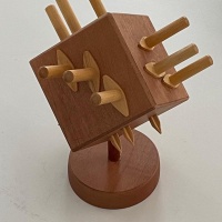 Following description from Bits & Pieces:"If the knights of medieval times thought pulling Excalibur from a stone was tough, they would never have got a handle on this challenge. Are you up to the task? You'll need to remove each bamboo sword from the wooden block and then replace them all in the proper sequence. It will test you to the hilt. Beautifully crafted.