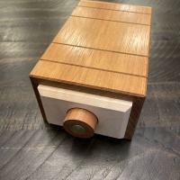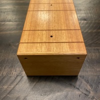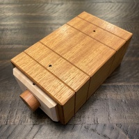 Noodling Box is Eric Fuller's latest puzzle box creation. Its name was inspired by the art of "noodling" catfish from their underwater caves. The project began as a simple trick box, but Eric was drawn to more exciting possibilities as the design progressed. The final creation is a complex, layered puzzle appropriate for intermediate and advanced collectors. To solve Noodling Box, you must find the prize hidden within. Doing so requires convincing a very reluctant drawer to give up its secrets. Multiple layered locks and devices stand between you and the goal. Eric has come up with some new tricks and deceptions that will keep you fishing for quite some time! Handcrafted according to our finest standards, Noodling Box was made in two variations; African Teak and Quilted Sycamore, with the other from Lacewood and Walnut. Fit, finish, and operation are sublime...each component moves smoothly and reliably. Noodling Box ships in an unsolved configuration and is signed and dated. There were approximately 55 copies of each variant made. |