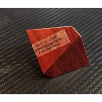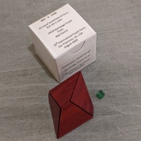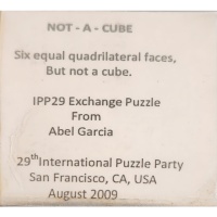 IPP-29 exchange puzzle from Abel Garcia. There are 6 quadrilateral faces but not a cube (Hence the name). Made from Jatoba and steel dowel pins.