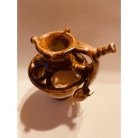 “Despite their ancient origin, puzzle vessels did not run out of innovation just yet (see William Waite’s creations).  This jug is a modest contribution to the genre, adding a variation to the most common design - though I just heard that a related idea may have been used in a Victorian jug.”