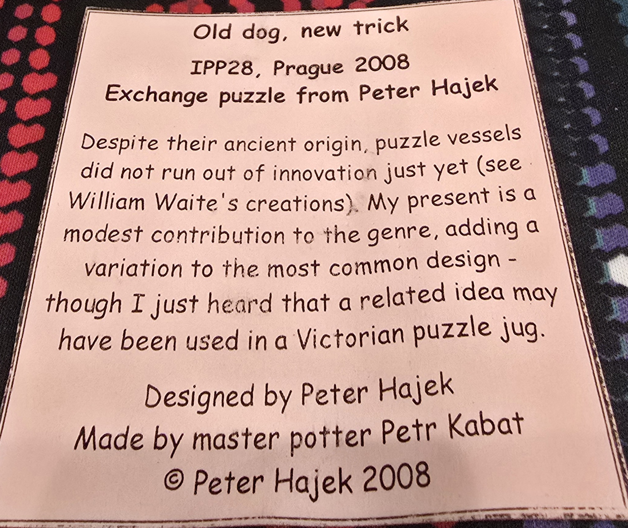 This is a rare opportunity to own a unique ceramic puzzle vessel from the 28th International Puzzle Party (IPP28) held in Prague in 2008.