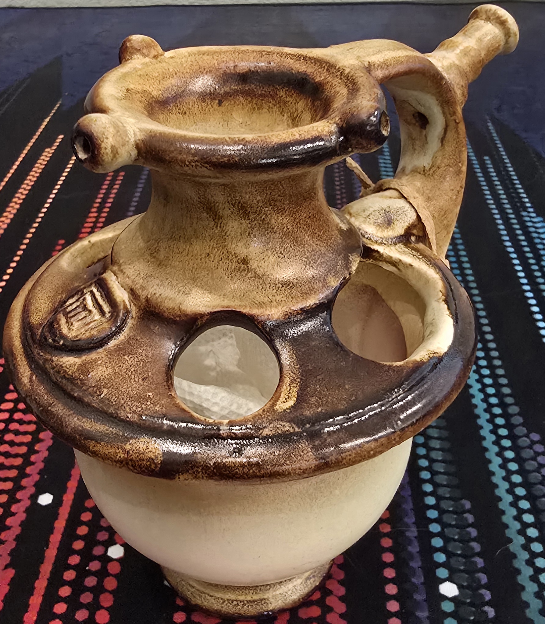 About the Puzzle: Titled "Old Dog, New Trick," this vessel is a sophisticated variation of the classic Victorian puzzle jug. The design features a perforated neck that prevents traditional pouring, requiring the user to discover a hidden "trick" involving suction and hidden channels to drink from the nozzles.