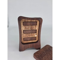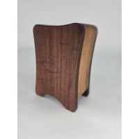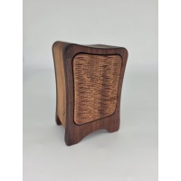 Oleg's Inspiration is not a puzzle, but it did eventually lead to one. Dimensions are 7.5 x 5 x 3 in. It has a beautifully textured door and an inscription on the inside that reads, "There seems to be within all of us the desire to live in a world of fantasy". Three small drawers make up the storage area. This one of a kind item is made from sapele and African striped mahogany. This was the piece that I drew inspiration from to build Oleg's Wardrobe.