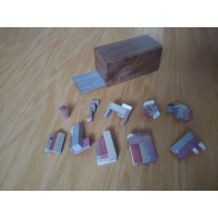 First, the puzzle is received as a sealed up and heavily lacquered rectangular box. Then as the solver pushes the lid open, the "pin" piece pops up. Like a grenade, when the pin is pulled, pieces will go flying! Hopefully to less than fatal consequences for the solver though! The challenges of the puzzle is three-fold: