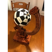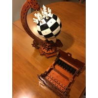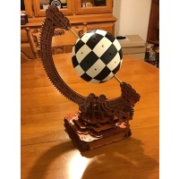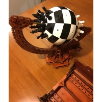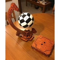 Made from 569 pieces. Most of the 569 are laser-cut poplar plywood pieces which have all been stained and varnished. There are also a number of 3D printed pieces: 64 'chess board plates' which make up the Orb itself, and the 32-member chess-court (pawns, knights, rooks, etc) were created by 96 separate pieces [each figure of the court is made up of 3 parts].