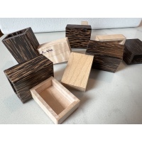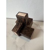 Oskar's Matchboxes have always been one of my favorite designs. Very few puzzles come close in terms of originality, appearance, and overall appeal. The five pieces consist of an outer box and inner tray cleverly glued together. The goal is to assemble the pieces to contain every tray inside a box. With only two solutions, this is quite tricky! Matchboxes is quite time-consuming puzzle to craft. Each piece is constructed using the same robust shoulder joinery we used to make the Tube It In puzzle. The result is a puzzle that looks small and fragile but is really quite strong. Fit and finish are sublime; each piece has minimal movement once joined with another. Here is an excellent blog review of Matchboxes by Neil's Puzzle Building Blog. 47 total copies made for sale, each signed and dated. 20 Copies in Black Palm, 6 Copies in Canarywood, and 21 Copies in Leopardwood. Oskar's Matchboxes is shipped in an unsolved configuration. |