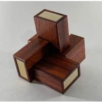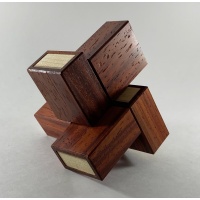 Description: Fabricated by Eric Fuller at Cubic Dissection. Oskar's Matchboxes has five dissimilar pieces consist of an outer box and inner tray cleverly glued together. The goal is to assemble the pieces so that every tray is contained inside a box. With only two solutions, this is quite tricky! Oskar’s Matchboxes is a very time-consuming puzzle to make, with all pieces constructed using the same shoulder joinery that we used to make the Tube It In puzzle. The end result is a puzzle that looks small and fragile but is really quite strong. Padauk version released in 2020.