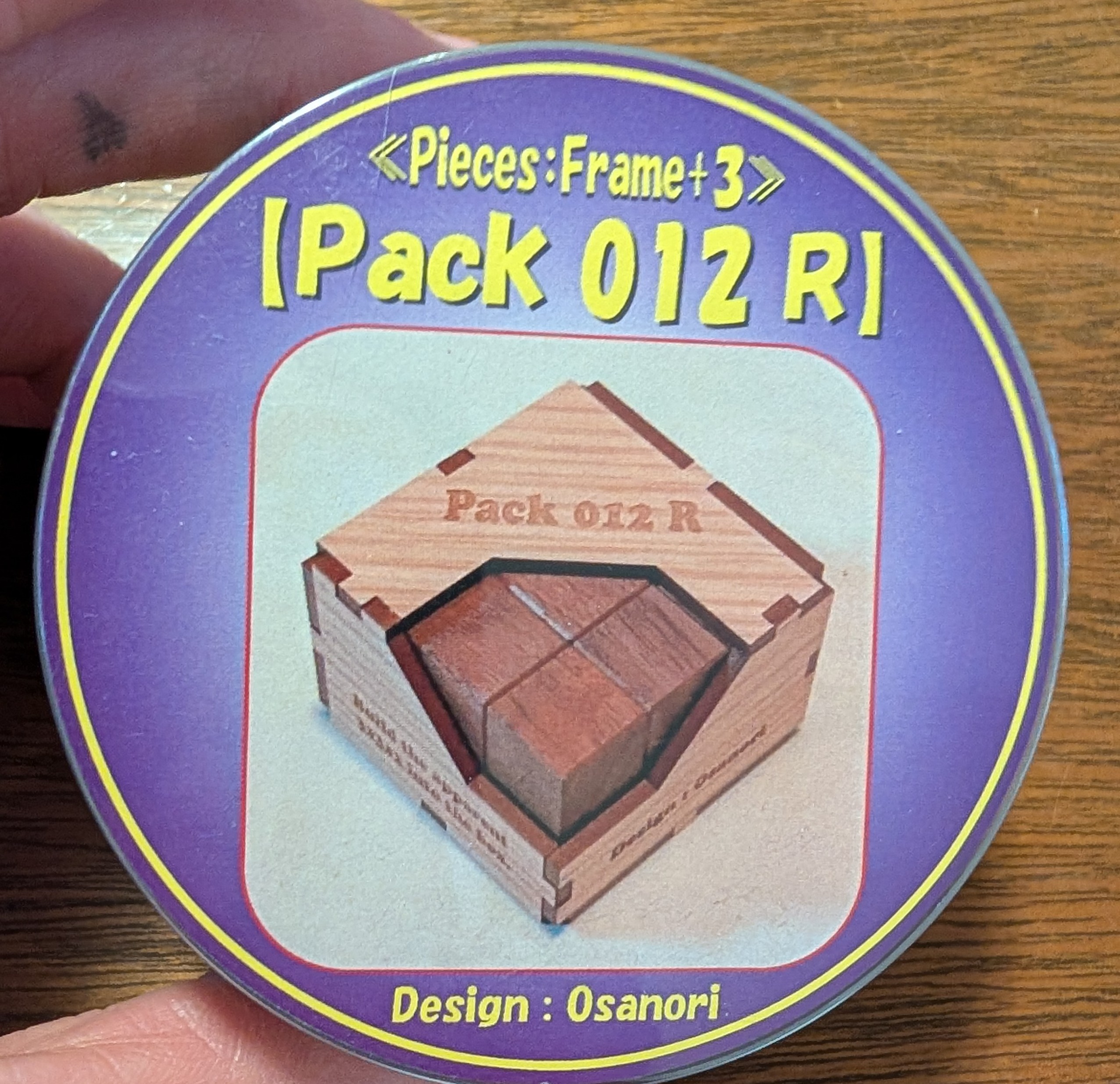 Bought directly from Osanori Yamamoto. Pack 012R is a wooden packing puzzle designed and made by Yamamoto. The goal is to pack all the pieces inside the frame with no visible holes. The puzzle has been solved a couple of times and is in as-new condition.