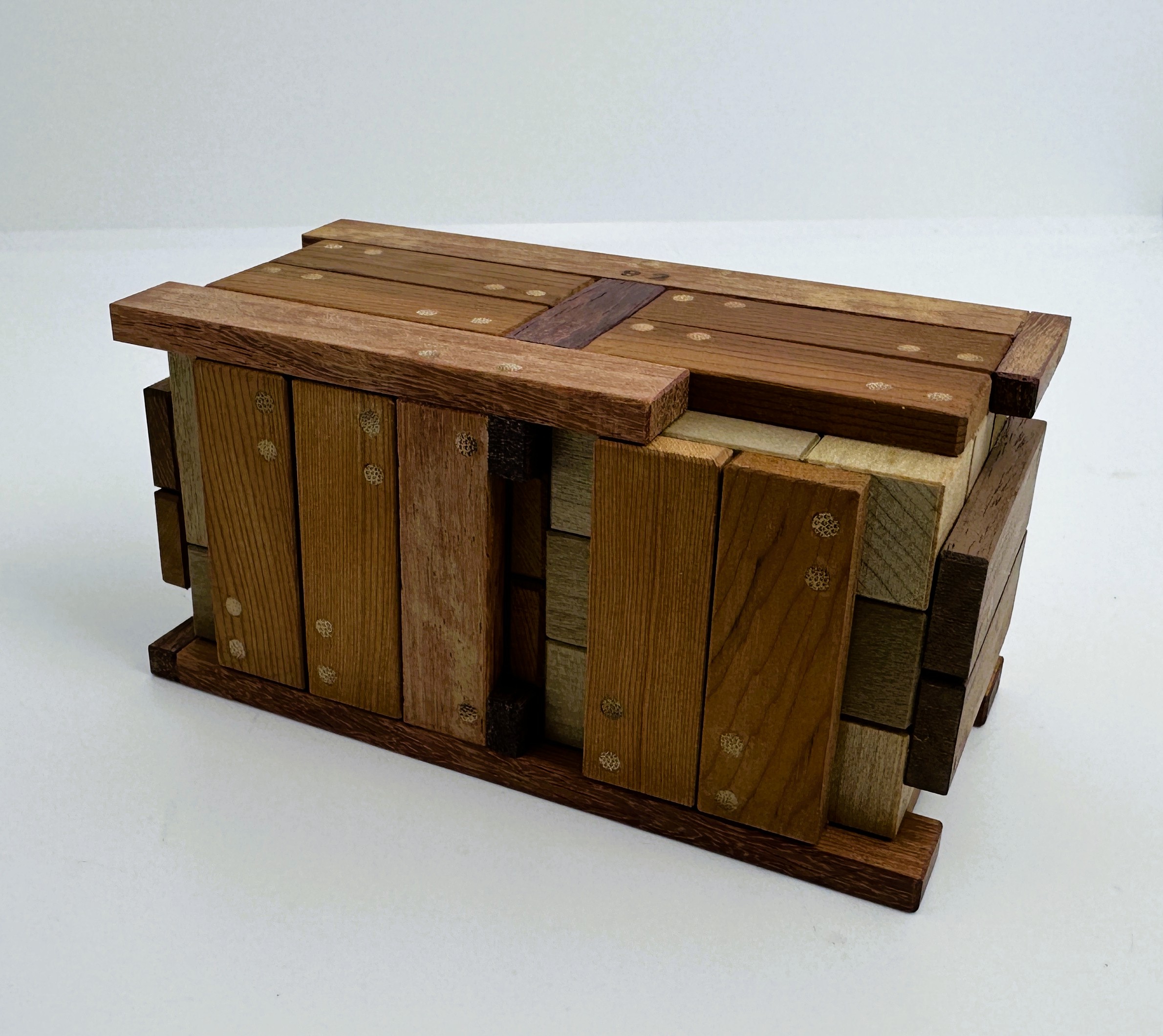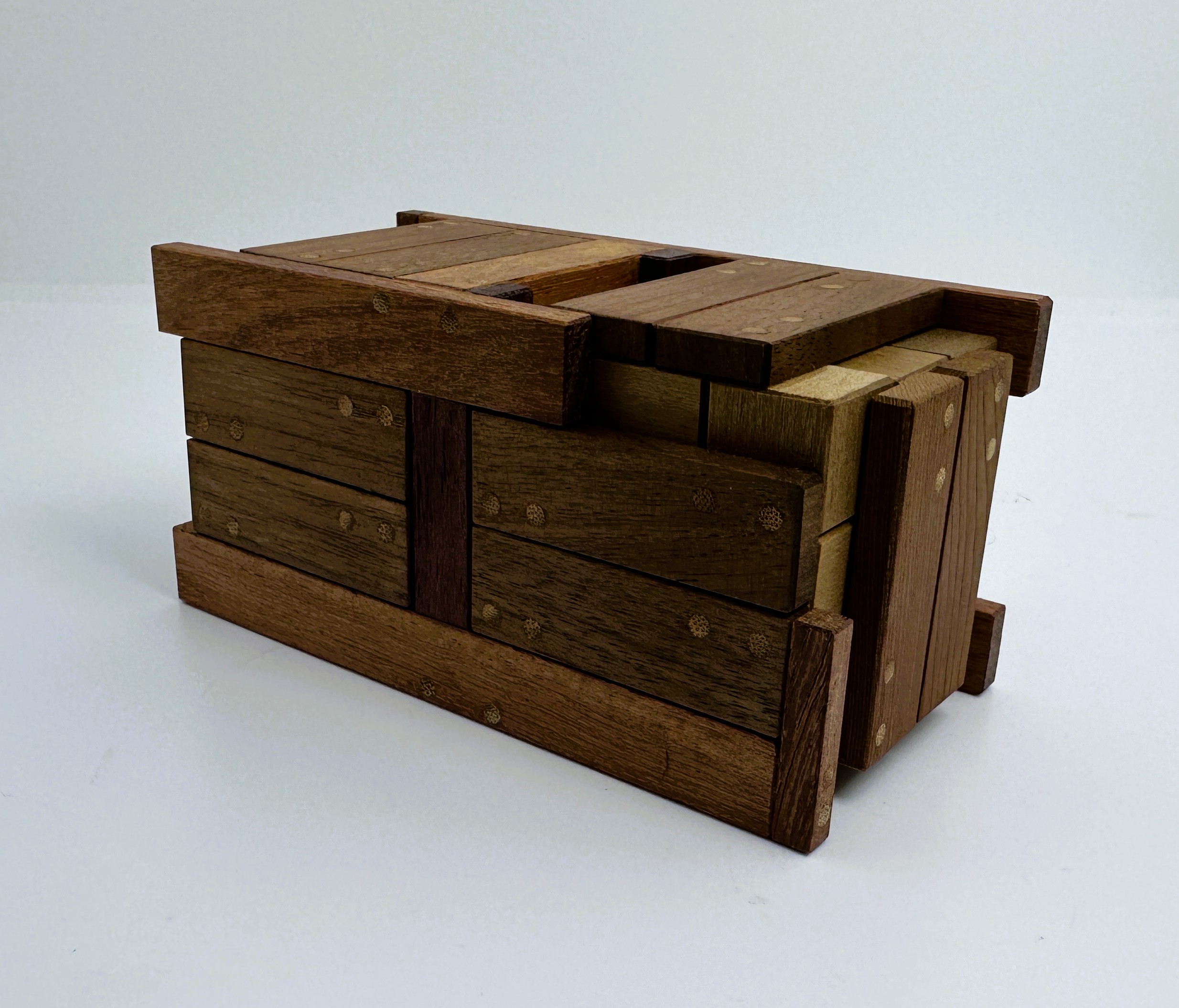 Materials:  A number of different woods from Japan.  Very nice looking woodwork with pinning detail.