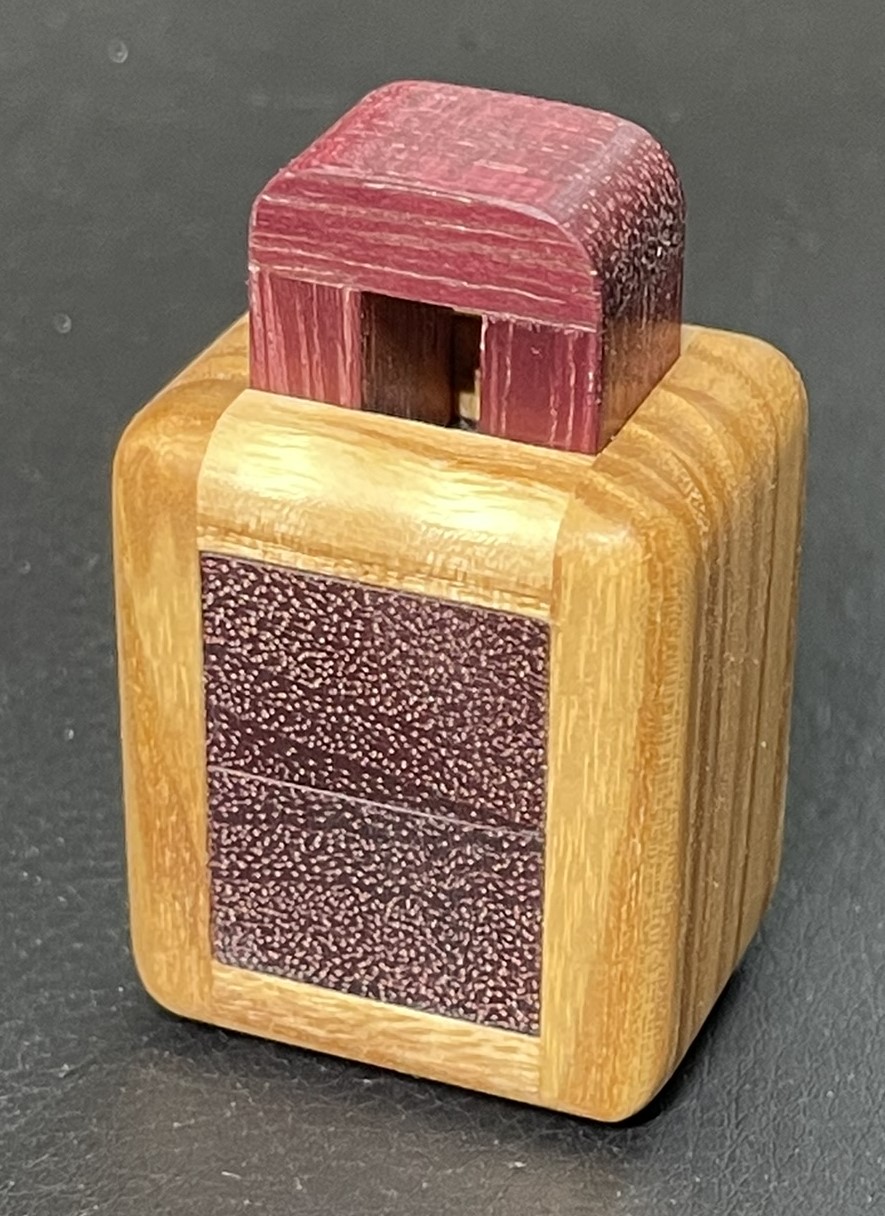“The Mini Lock was originally designed just to have a test vehicle for 3D print. Together with a good puzzle friend, we wanted to check how small it can be printed to get a stable puzzle. The 3D printed result was quite nice, and the solving sequence was much fun, so I decided to let it being produced in wood. The puzzle consists only of a frame with one obstacle, a shackle, and two sticks. With a level 6.7 it is not a difficult puzzle, but it can be operated like a tiny padlock, which is a nice touch. When I received Pelikan's sample, I was amazed what they made of the design. They have been able to build it in a tiny size, only about 25 gramms. Nevertheless, the woodworking is fabulous, very precise, tolerances are just perfect, and the wood selection is breathtaking. It is a cute little gem, I love it!”