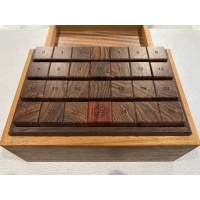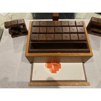 The Penultimate Burr Set is something I've wanted to make for a very long time. I love burr puzzles, and the versitility and value of burr sets is unmatched. This set of 27 numbered pieces combines to make hundreds of puzzles, from fairly simple solid assemblies to extremely difficult higher level assemblies. Never before offered in six unit length, a new analysis of the set was performed by Ken Irvine and revealed many problems which were unachievable with the traditional eight unit length pieces.The box itself is quite special; the lid lifts off to reveal precise, ordered rows of burr sticks. What's missing are the instructions, hidden in a concealed compartment and protected by a puzzle box mechanism. You must solve the puzzle box before beginning work on the burr sets. This puzzle offers hundreds of hours of puzzling value!