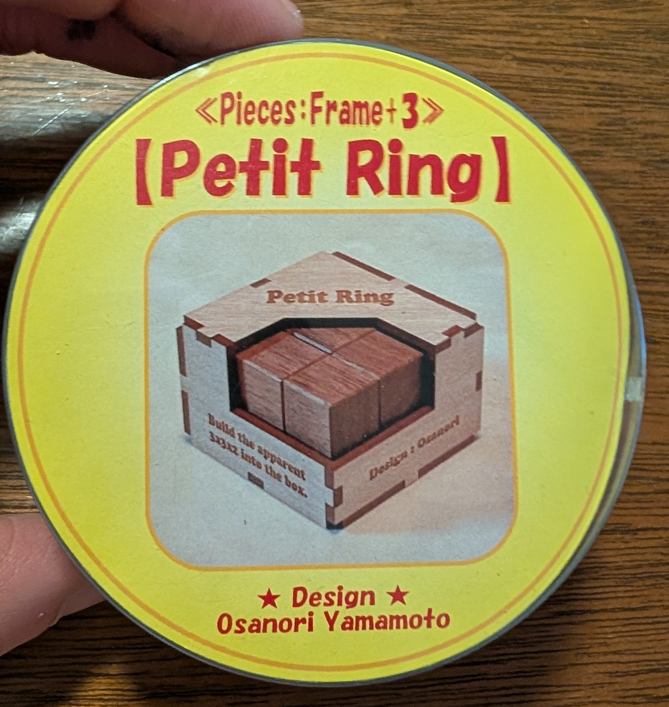 Bought directly from Osanori Yamamoto. Petit Ring is a wooden packing puzzle designed and made by Yamamoto. The goal is to pack all the pieces inside the frame with no visible holes. The puzzle has been solved a couple of times and is in as-new condition.