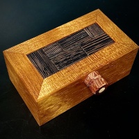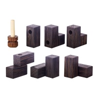 “This delightful little packing puzzle by the amazing Lucie Pauwels really packs quite a punch. It is surprisingly heavy for its’ size which I presume is due to the density of the Jatoba box. The pieces are made from Wenge and there is a beautifully made pin made with Maple and Bubinga. The pieces are a small subset of the Soma pieces with 4 of them having a hole drilled through. The aim is to assemble the pieces inside the box leaving space for the pin to be poked through the hole into the piece which lines up with it. There are obvious 4 different solutions depending on which piece you wish to pierce. I found this a delightful little challenge to try in the evenings and finding the final one took me a surprising amount of time (but then I am usually terrible at packing puzzles). This is a lovely puzzle for beginners and experienced puzzlers alike. Lucie has contacted me free I posted this to correct me and tell me the true aim: ‘The goal of the Pin-Up Box is to pack everything inside and fix with the pin, in a way that nothing drops out when you hold the box upside down. Four pieces with a pin-hole, each giving a solution.’ Time to try again!”