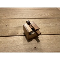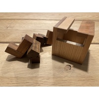“2D and 3D packing problems are my favourites, especially those with only a few pieces, together with a sufficient level of difficulty. I hope you will like Pincers and add it to your collection. You do not need to create the illusion of a full cube inside (like we all do with amazing packing designs by Osanori). Just fit the three pieces below the top layer. So what is the clue here? – the shapes of the pieces and box opening. Study them well to eliminate a huge number of possible assemblies (83) to fit in 3x3x3 cube. There is only one solution and the disassembly level is 9.4.3. Have fun with this puzzle.”