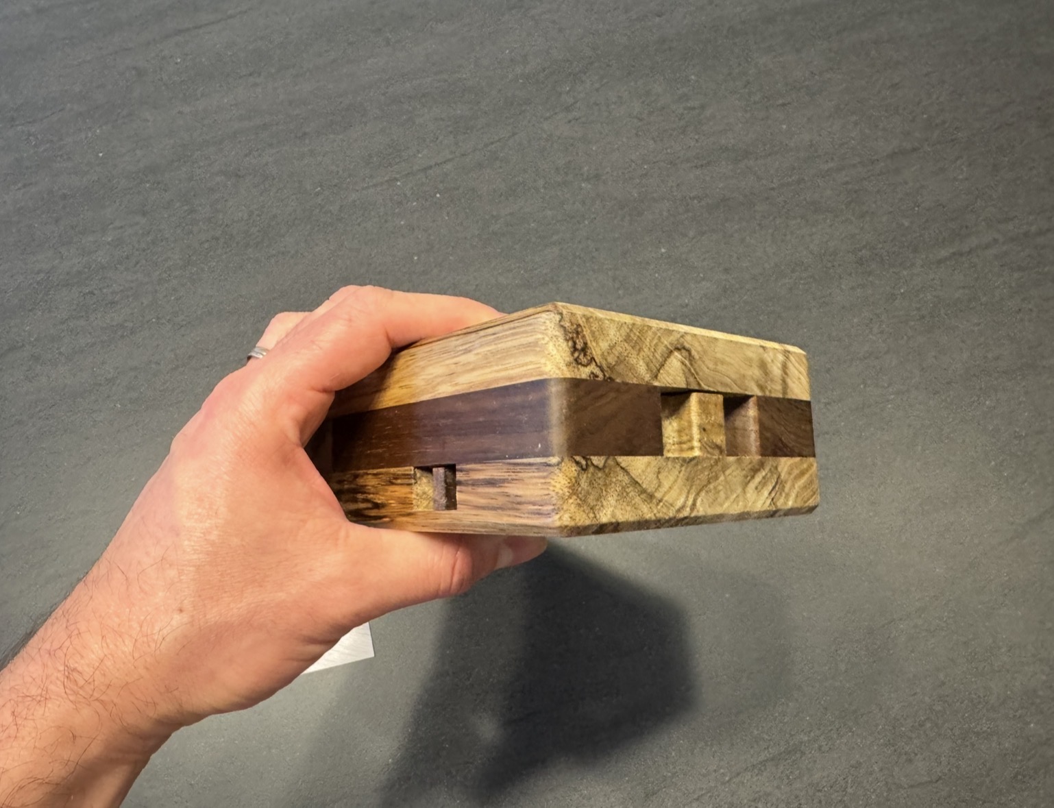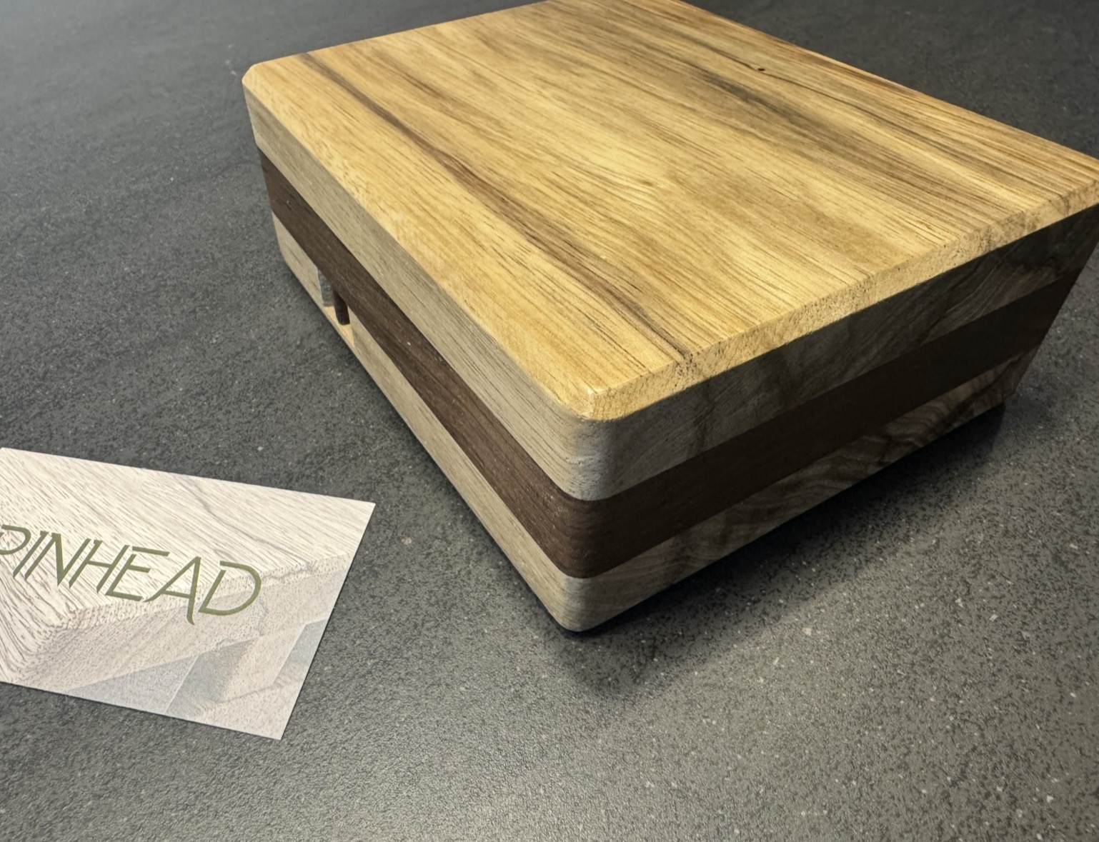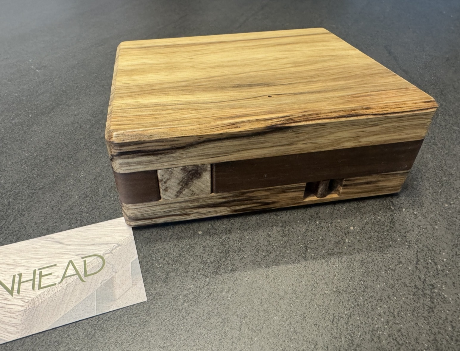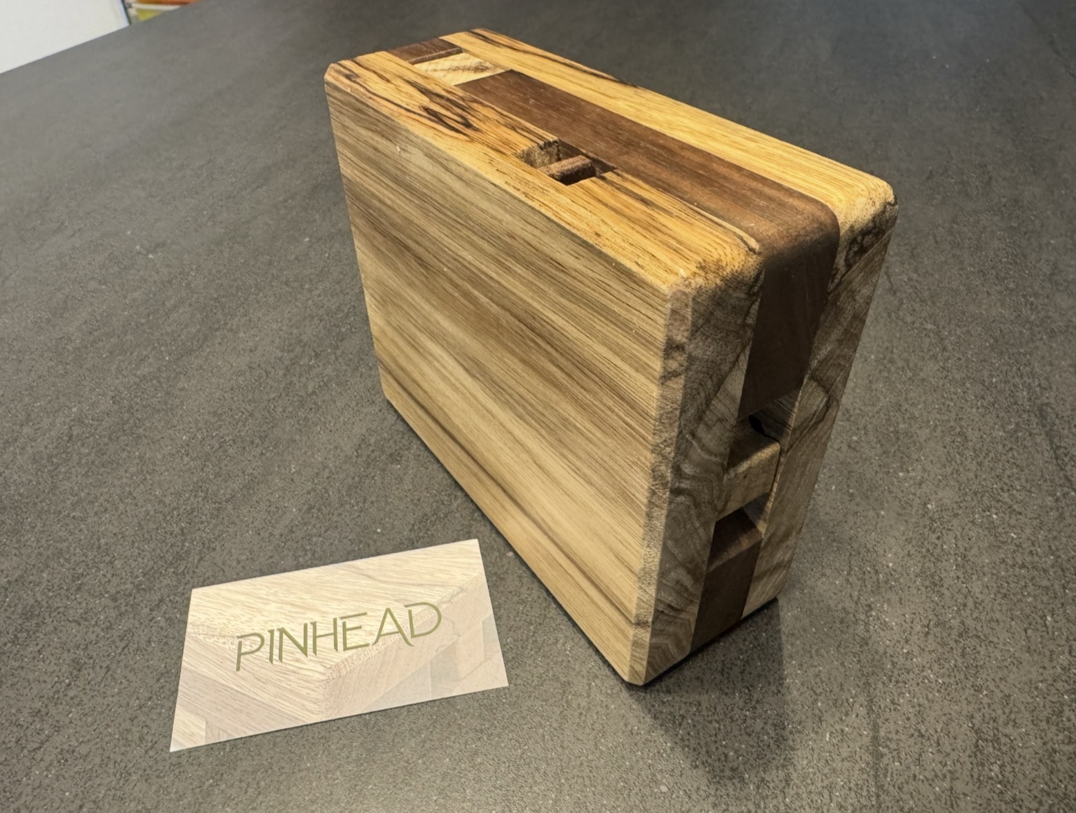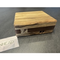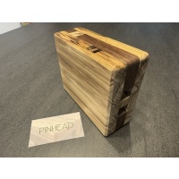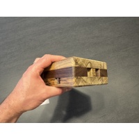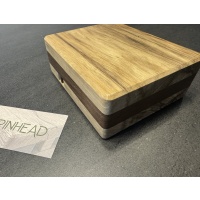 The rich, dark grains of Peruvian walnut meet the warm tones of black limba in this beautiful puzzle box. Beyond its striking exterior lies a hidden mechanism waiting to be discovered through a series of intuitive and satisfying steps. Test your wits with this medium difficulty puzzle. Pinhead measures 6 in x 5 in x 2 in.