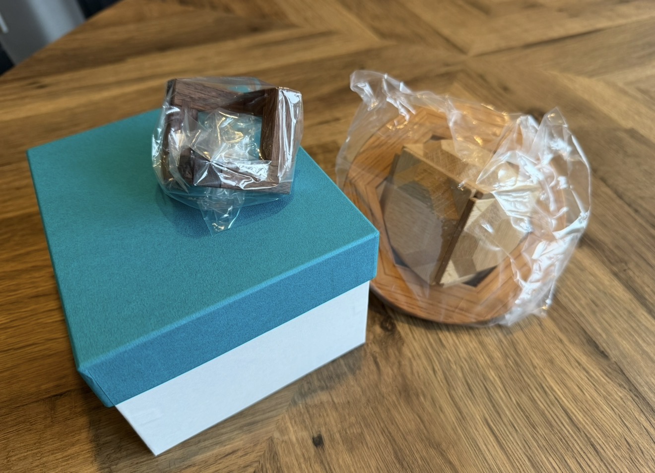 This Karakuri box is based on a planet with a ring. The ring is in the way and the lid will not open, but it does not require any force to remove the ring. Please wrack your brain and think of a solution. There is enough space for the finger ring.
