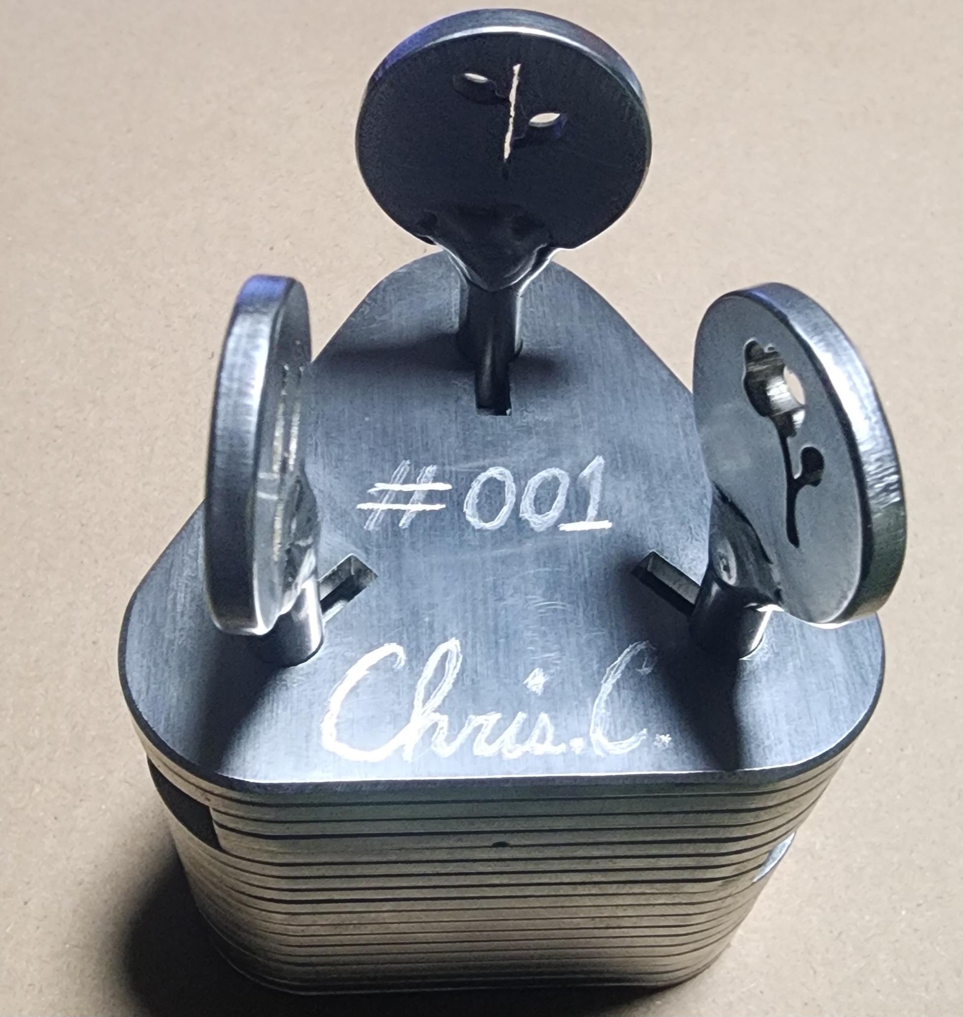 Up for auction is the #001 numbered Father and Son Dueling Keys by Christian CormierI am the original owner of this puzzle and it is in perfect working conditionThis is a very heavy puzzle made of stainless steelIt has been solved and reset many timesBuyer to pay shipping and insurance TBD at the end of the auctionI accept Paypal (FF preferred but never required), Zelle, and Wise