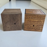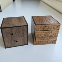 "These are two SD/mechanical puzzle boxes I designed in early 2024. Each takes about an hour to solve, with the goal of discovering the hidden themed token. The interior is 3D printed, while the exterior is veneered wood. I’ve produced 72 numbered sets, and when shipping, I’ll match production numbers so each set stays together. This is a limited release, and I won’t be making more in the future.