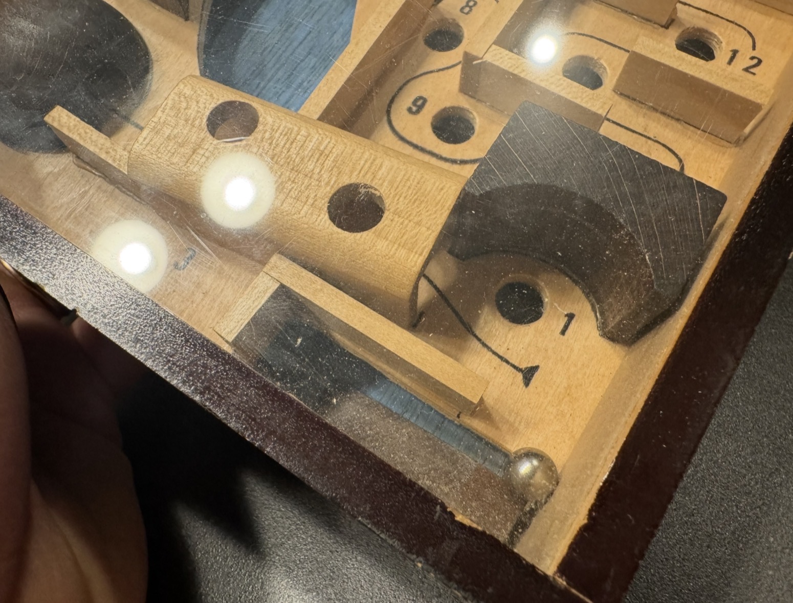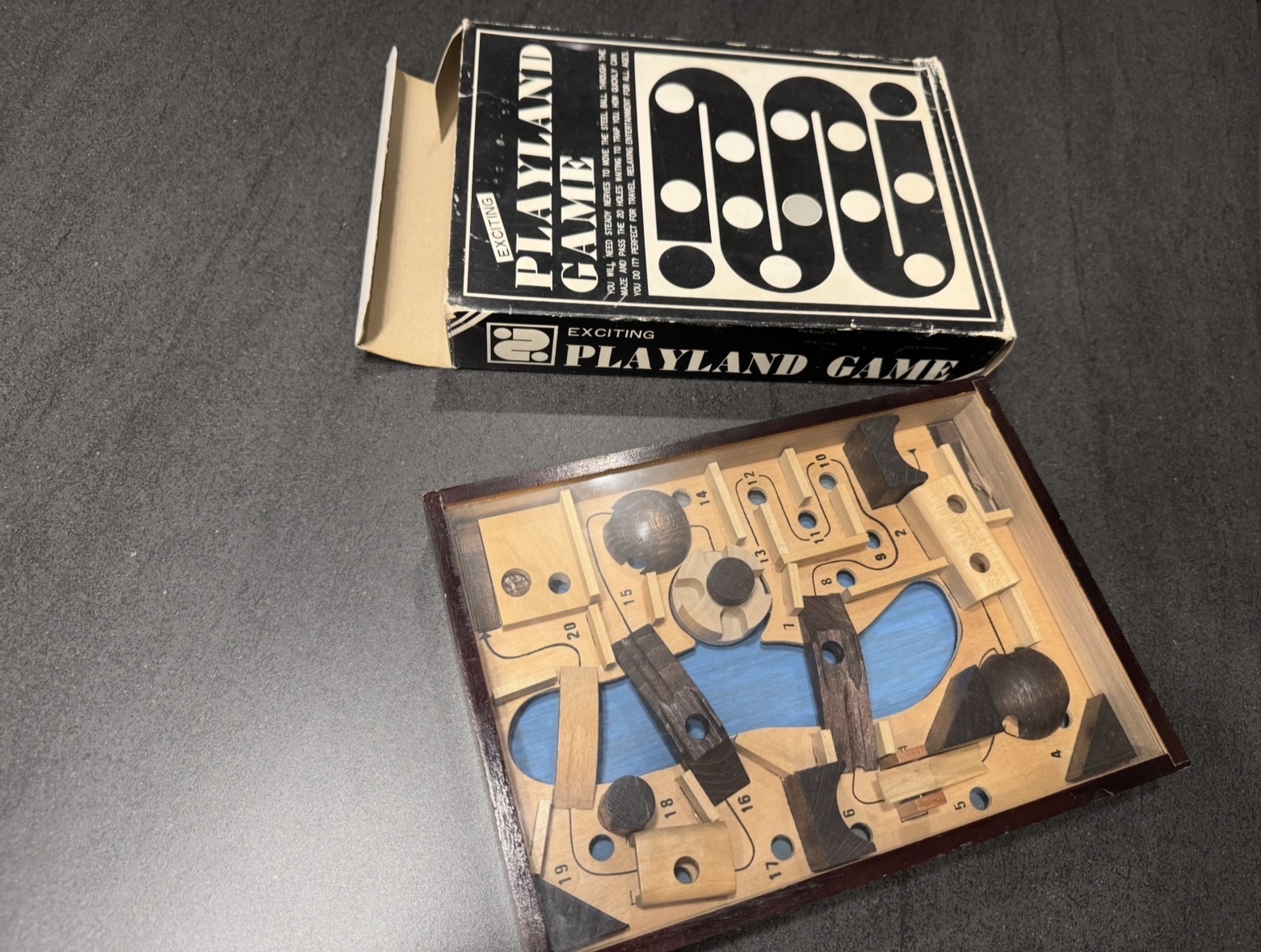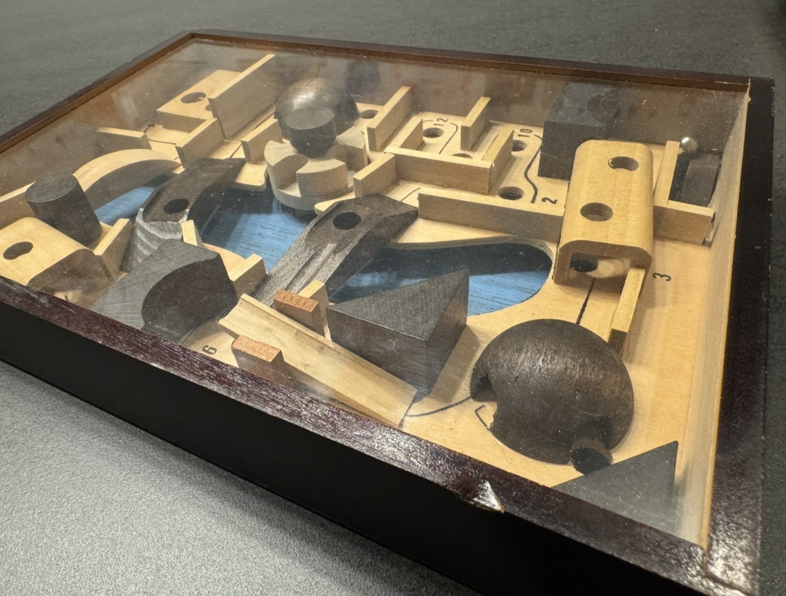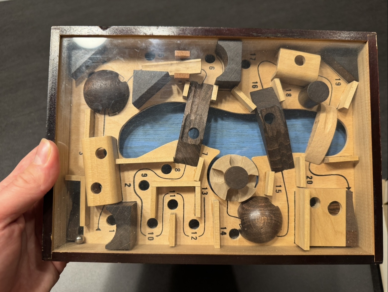 Larger sized 10" x 7" wood dexterity puzzle from WADA.  Goal is to get the ball through the labyrinth.  One of their larger puzzles, as big as SpaceLand. Acrylic may have darkened a little with age.  Puzzle has the WADA logo sticker on the back.