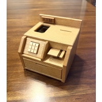 The motif is an ATM money machine (Automated teller machine). When you use an ATM to make a cash withdrawal, the drawer opens, you take out the money and a service fee is charged. When the drawer is closed, it will lock, and the fee will be removed from your account. At least one coin is always left inside. This contradiction makes the puzzle fun.