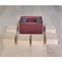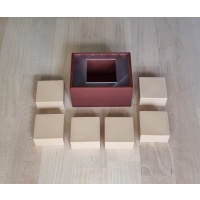 In this puzzle you'll have to fit 6 identical pieces into the box. The container has a limited opening, making it difficult to fit the pieces.