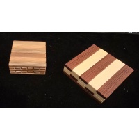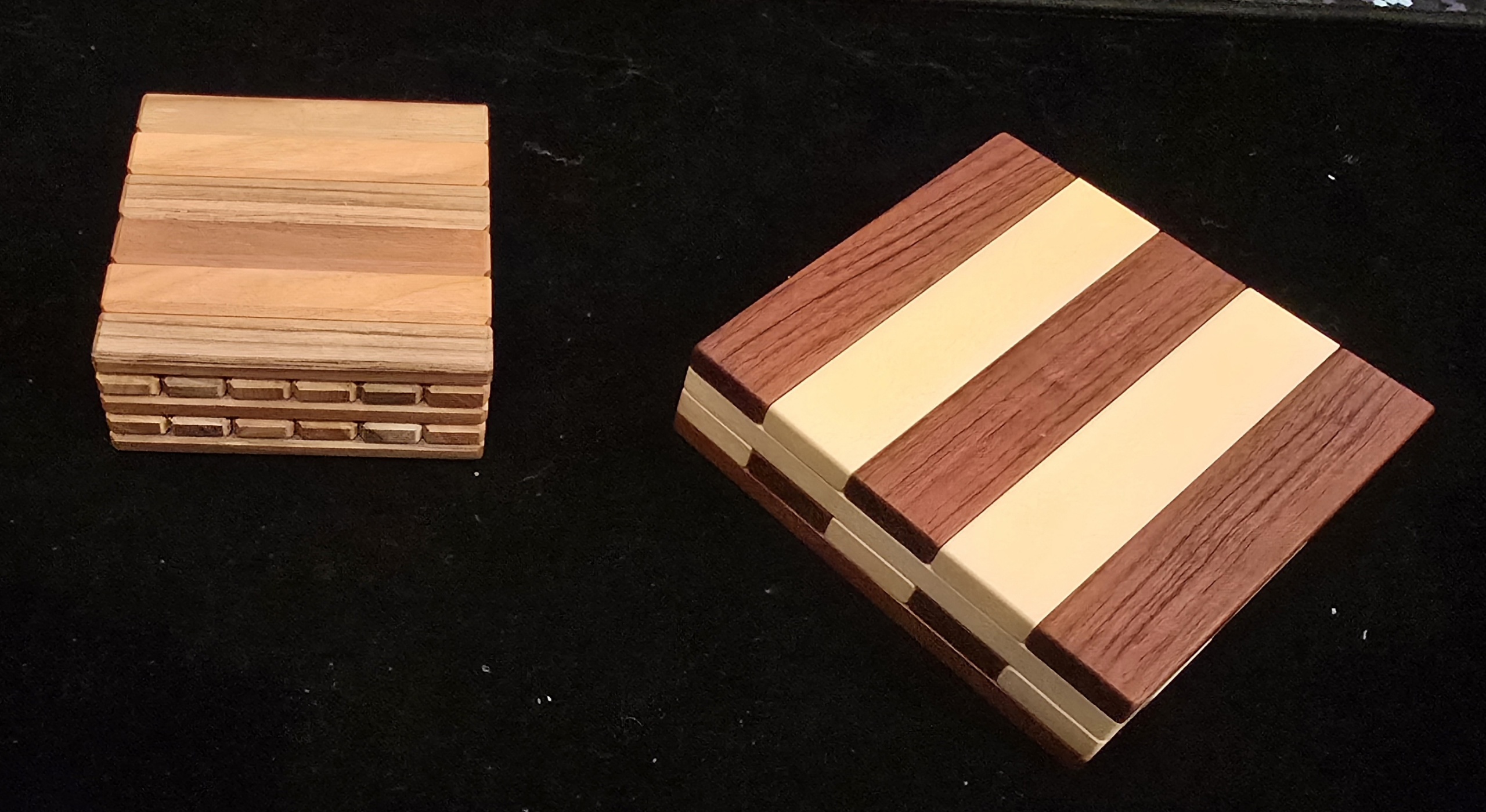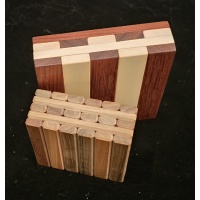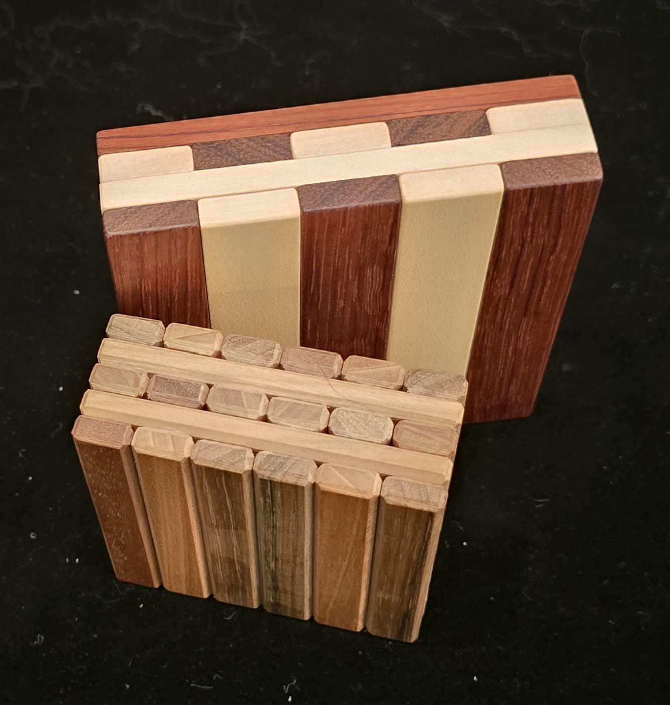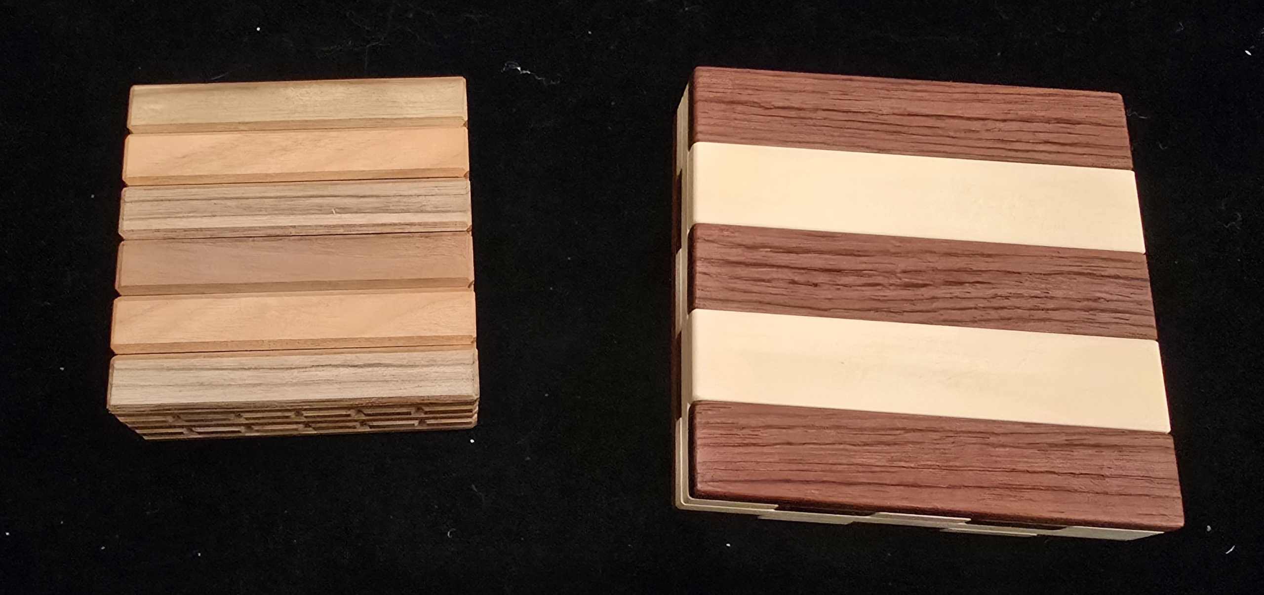 Included in this lot is the ingenious "Sticky Stack of Sticks," an exchange puzzle from IPP23 (2003). Designed by Bill Darrah and beautifully crafted by master puzzle maker Josef Pelikan, this interlocking brainteaser initially looks like a simple, striped wooden coaster, but quickly proves to be a formidable challenge to disassemble and reassemble.