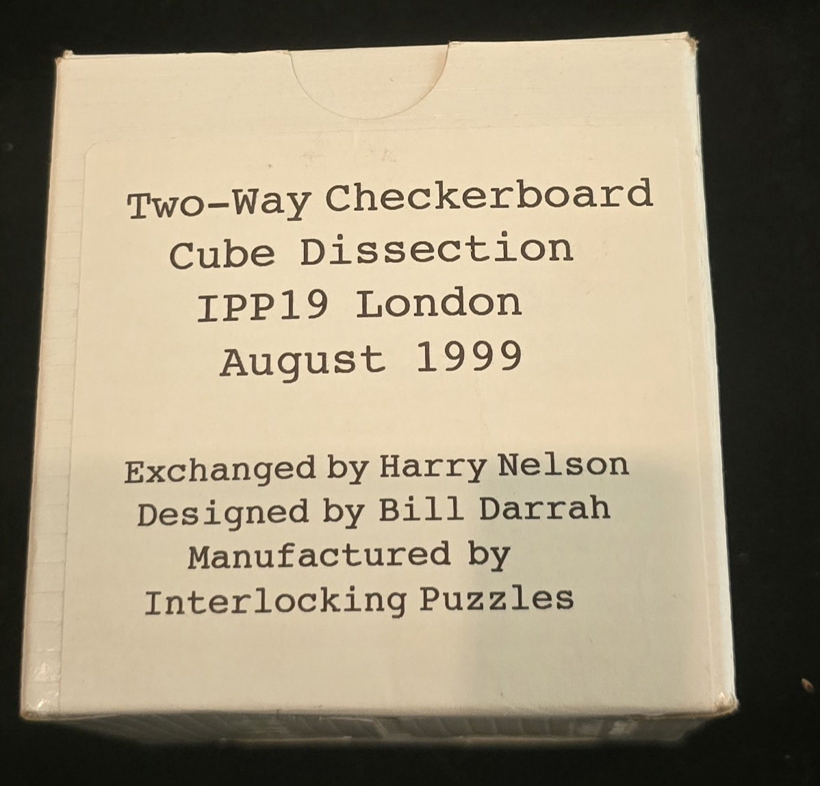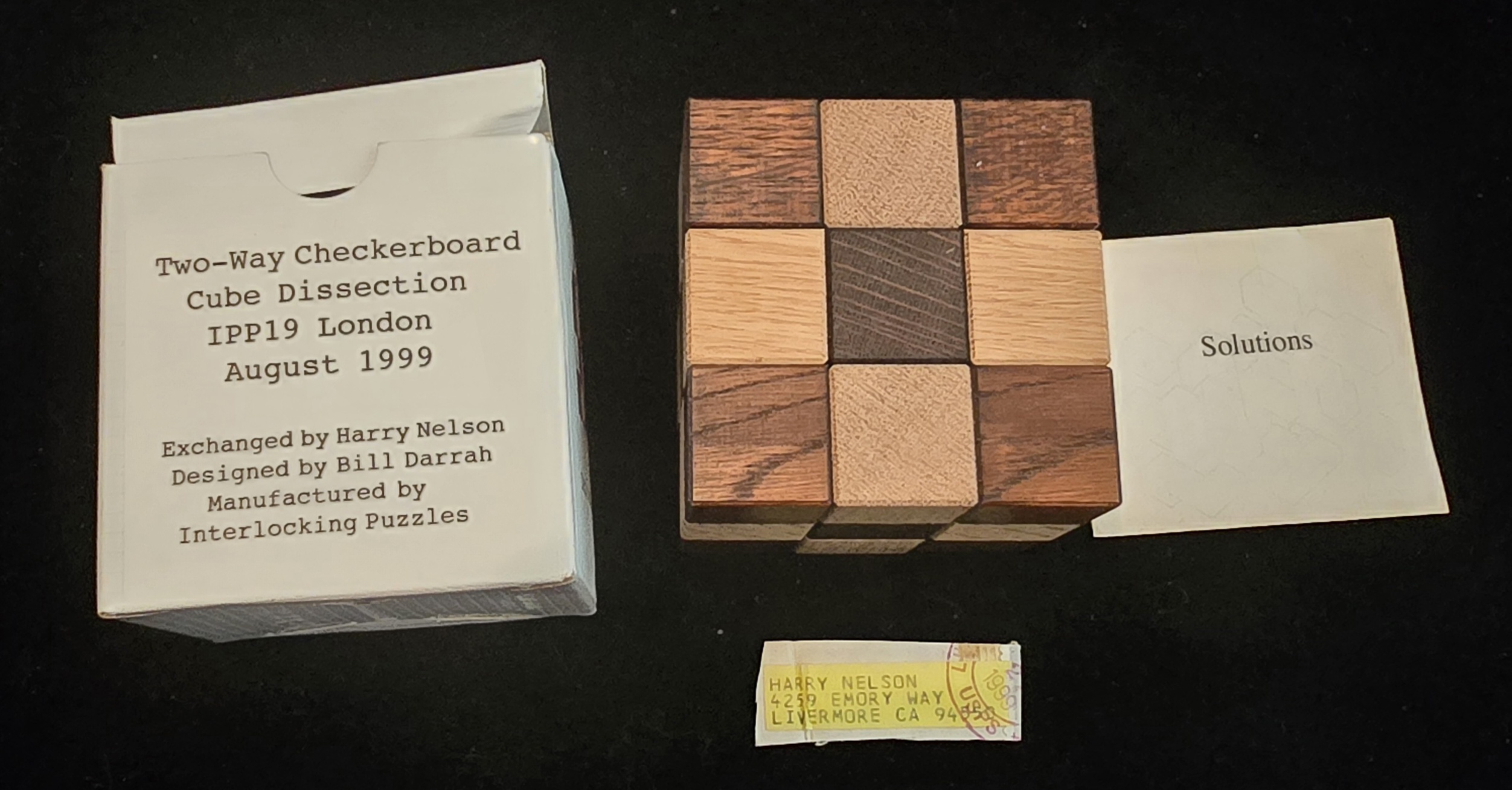 Exchanged at the 19th International Puzzle Party (IPP19) in London, August 1999, this masterpiece was designed by Bill Darrah himself and exchanged by the renowned Harry Nelson. It was precision-manufactured by Interlocking Puzzles, known for their elite-tier woodworking.