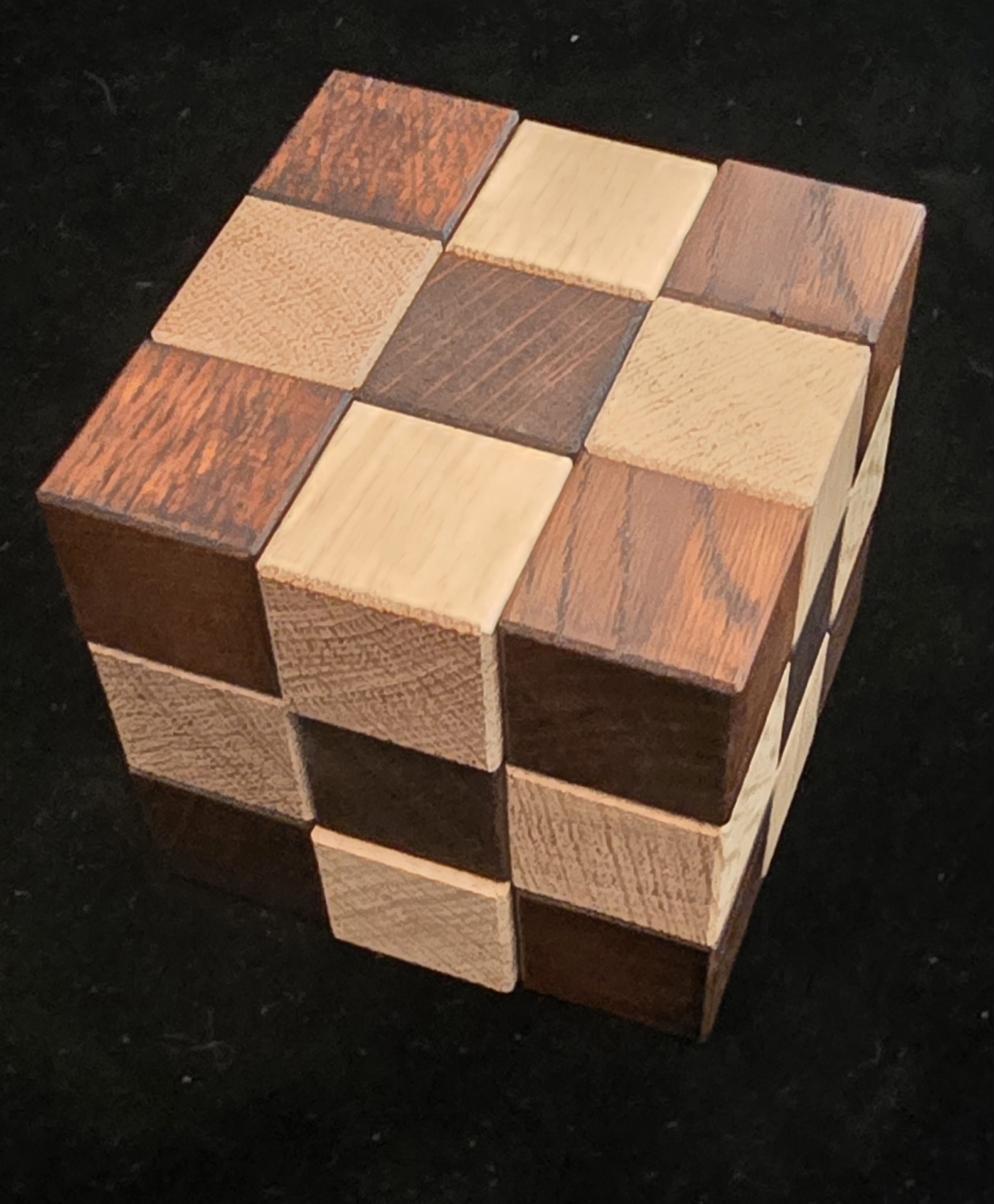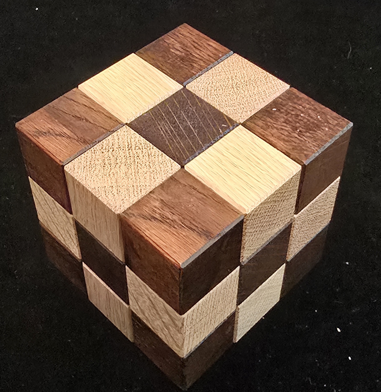 2. ​Solution B: Re-assemble the same pieces into a "Dark Cornered" checkerboard pattern. The pieces utilize complex "half-cube" geometry, making the solve significantly more challenging than it appears.