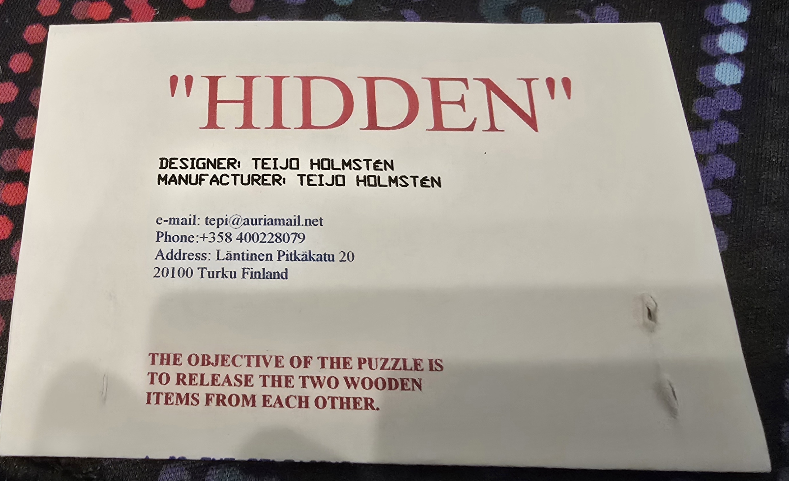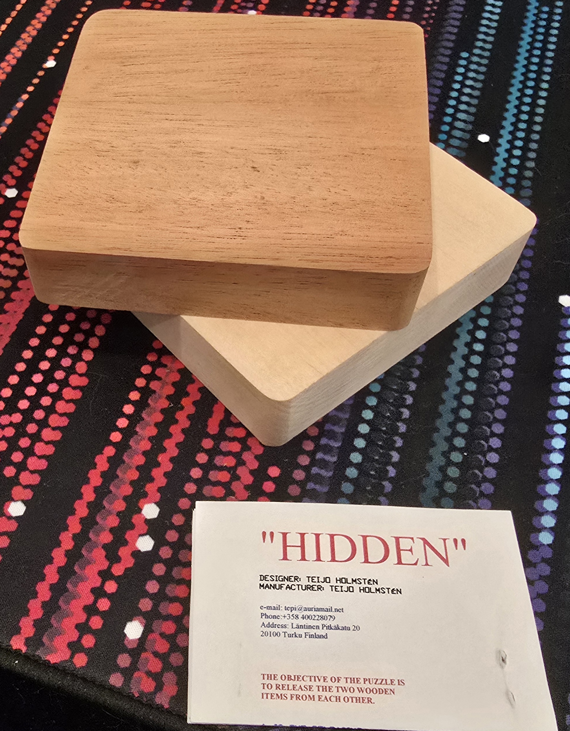 Teijo Holmsten’s work is legendary among the IPP community for its tactile elegance. Because exchange puzzles are produced in strictly limited quantities for event participants, "HIDDEN" rarely surfaces on the open market. This is a rare opportunity to own a piece of 2005 Helsinki puzzle history.