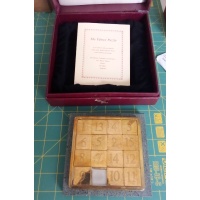 rare 15 sliding puzzle done in solid brass, mounted on granite  box and hinges are in poor condition , puzzle is in good condition , could use a buffing up