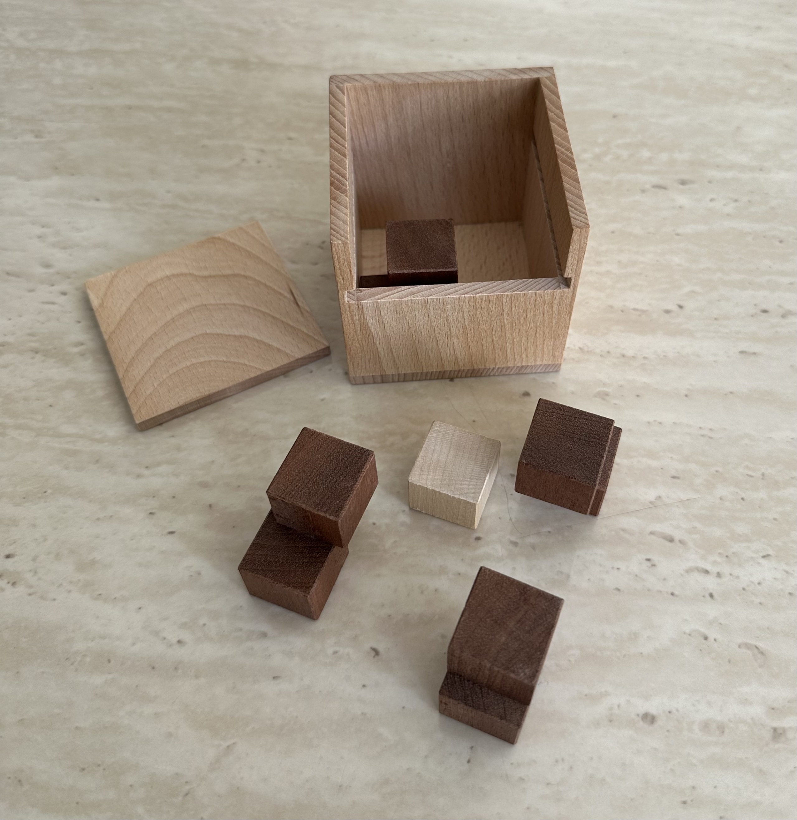 Very clever packing puzzle with the goal of packing all the pieces inside the box and closing the lid. With a very elegant solution.