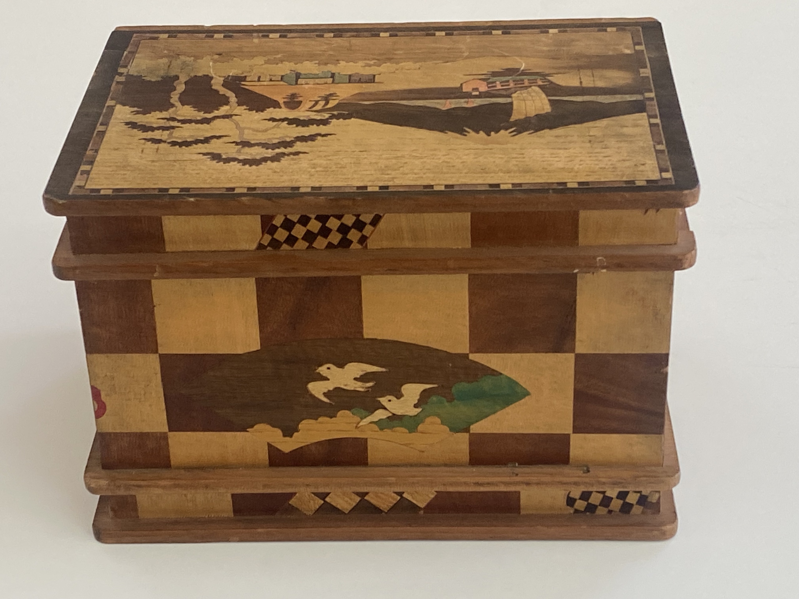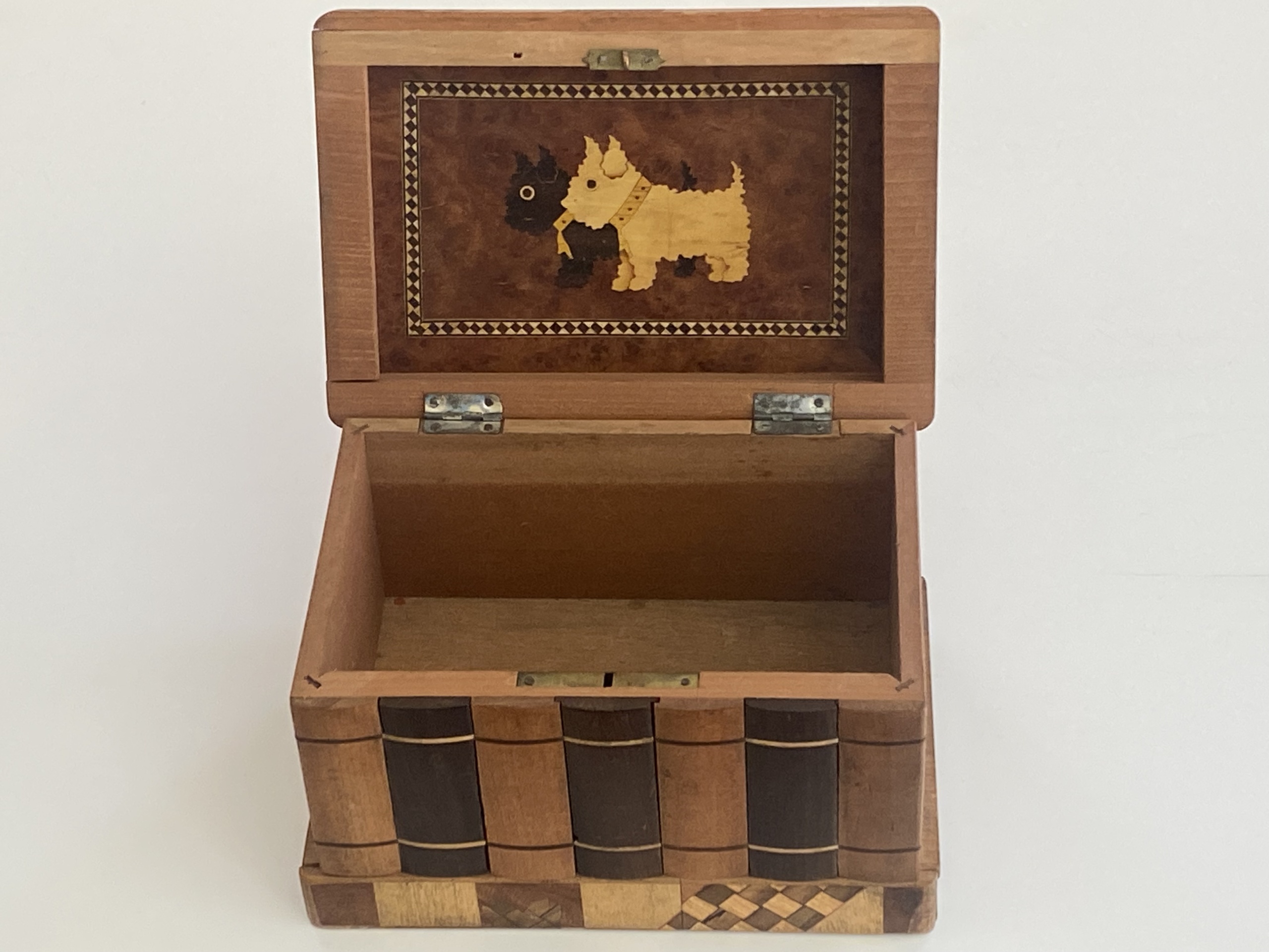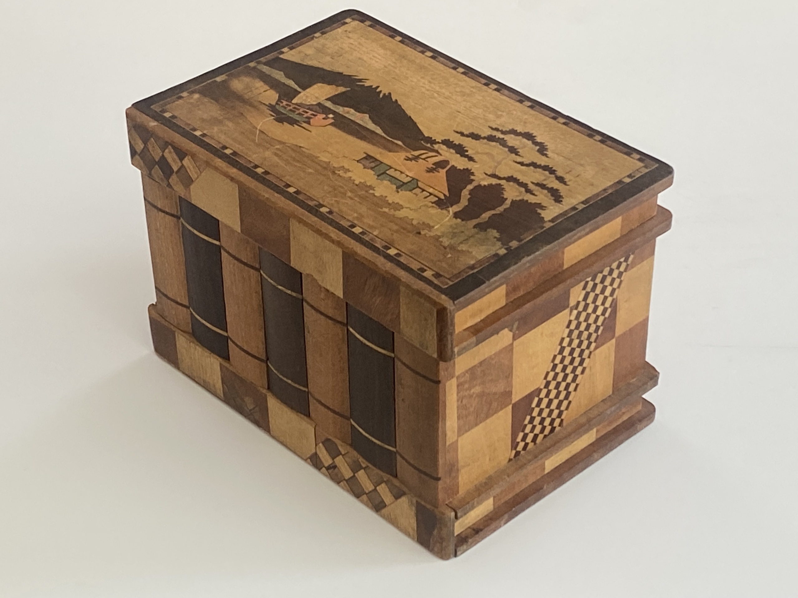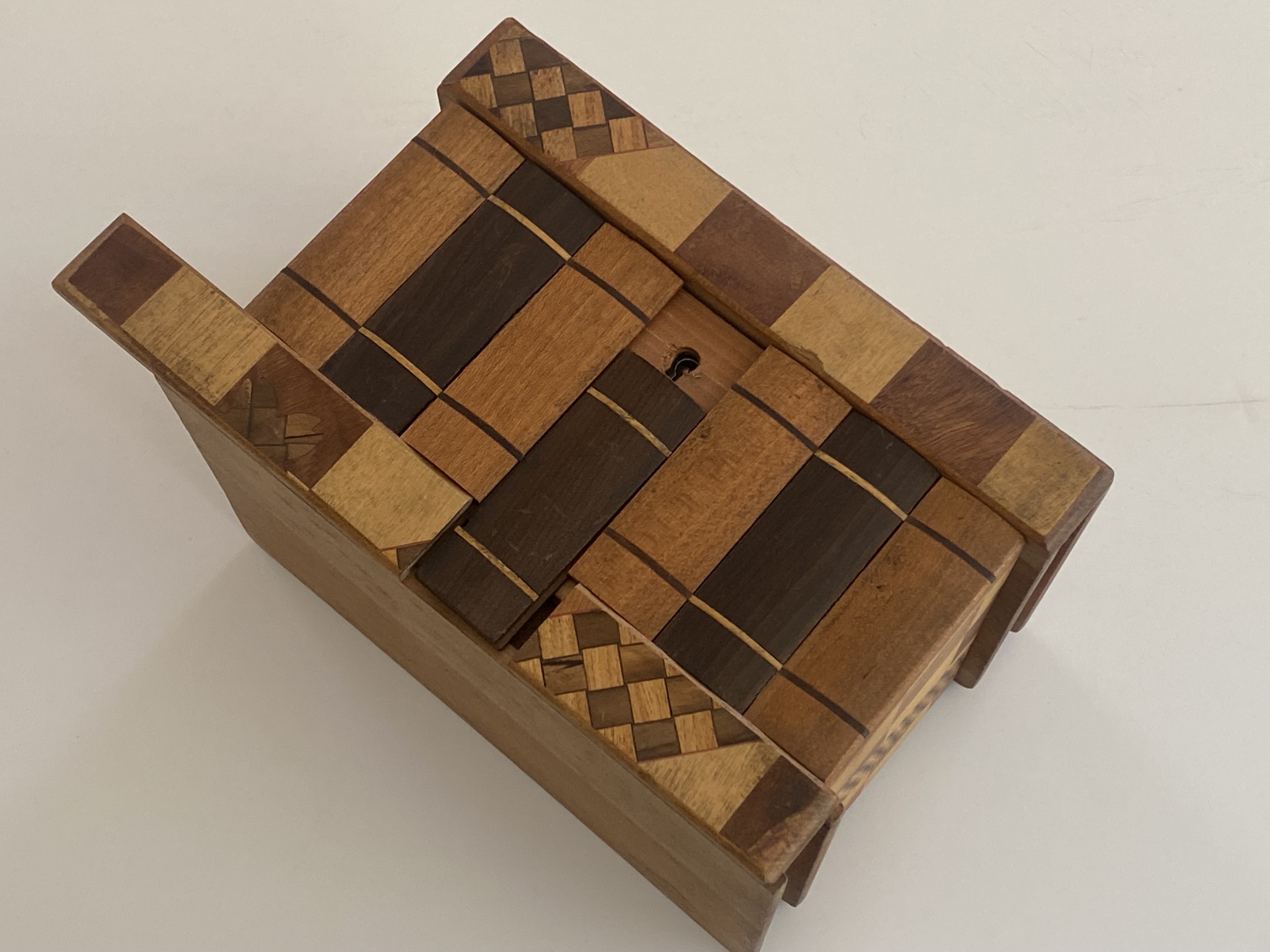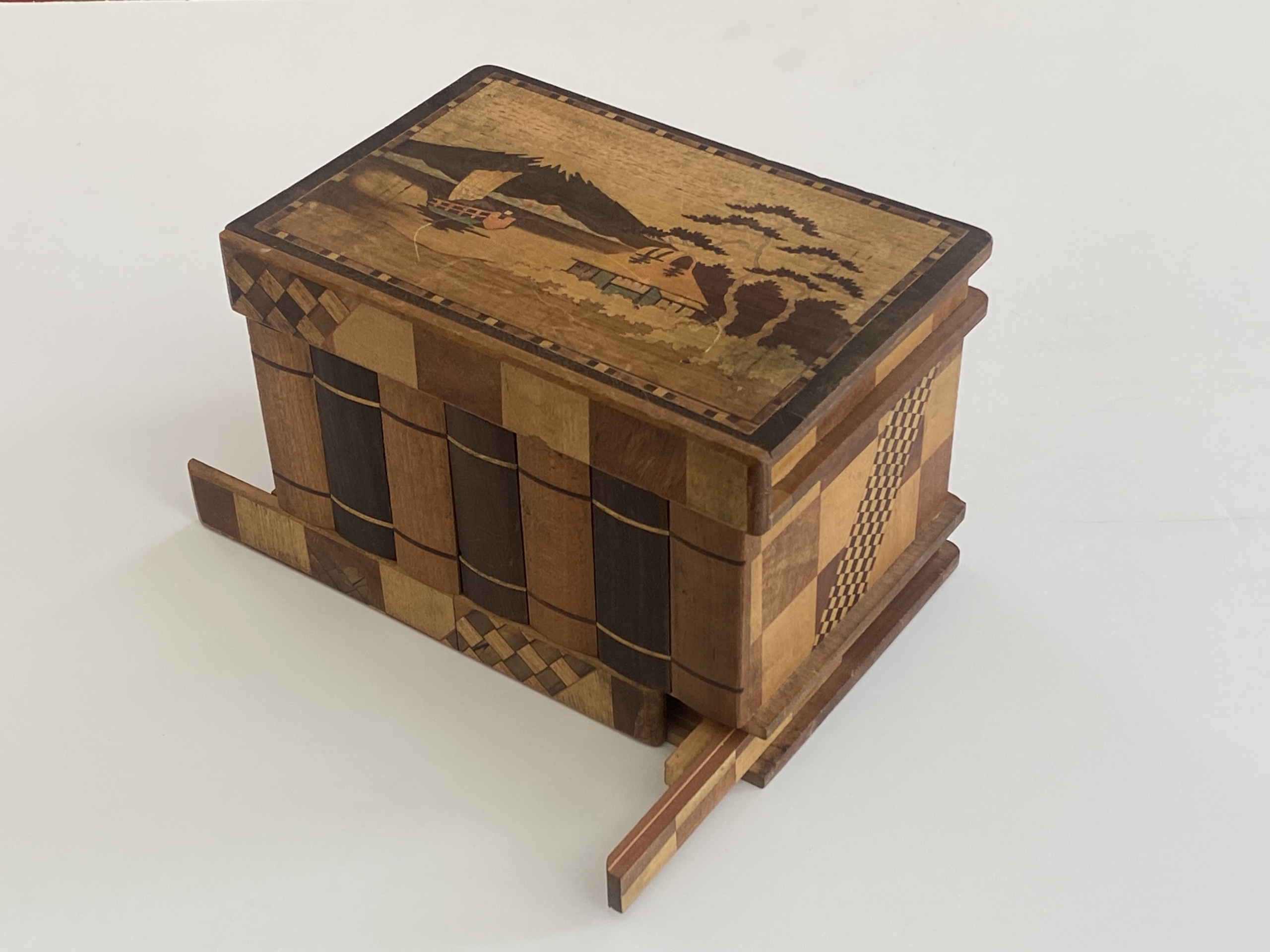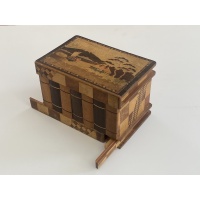 The Sansui Zougan (Mountain/Lake) inlay on the outside lid with the traditional Scottie Dogs on the inside standout on this puzzle. On the back are additional inlays of birds in flight with decorative Yosegi on all sides. The slide on the bottom is quite stiff and we do not have the key, however it is an amazing work and in wonderful condition! A great collectible for puzzle enthusiasts.