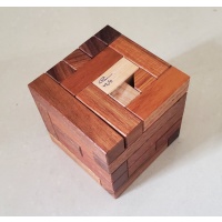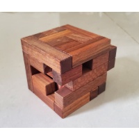 Tom emailed me this design a while back and kind of downplayed it. I thought it was a brilliant idea. As usual, I was right :-) This 5x5 cube is a shell with a hollow interior. Inside the cube is another 2x2 cube, minus one unit. The internal cube interacts with the shell in a maddening way, interfering with what should be a straightforward disassembly. There's even dead ends and false solutions. The large hole in the shell is there so you can poke your finger in and manipulate the inner piece. VERY fun design, and pretty tricky as well.