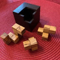 This beauty is stunning with a wenge wood box complete with a fairly large, but quite restricted opening and 3 pieces to be placed inside made from zebrano wood. You might ask: 'there are only 3 pieces…how hard can this be?' Well, this one has a serious challenge to it! Not only is the opening fairly restrictive, but the shape of the rattlesnake piece also ensures that the approach to insertion is very limited.