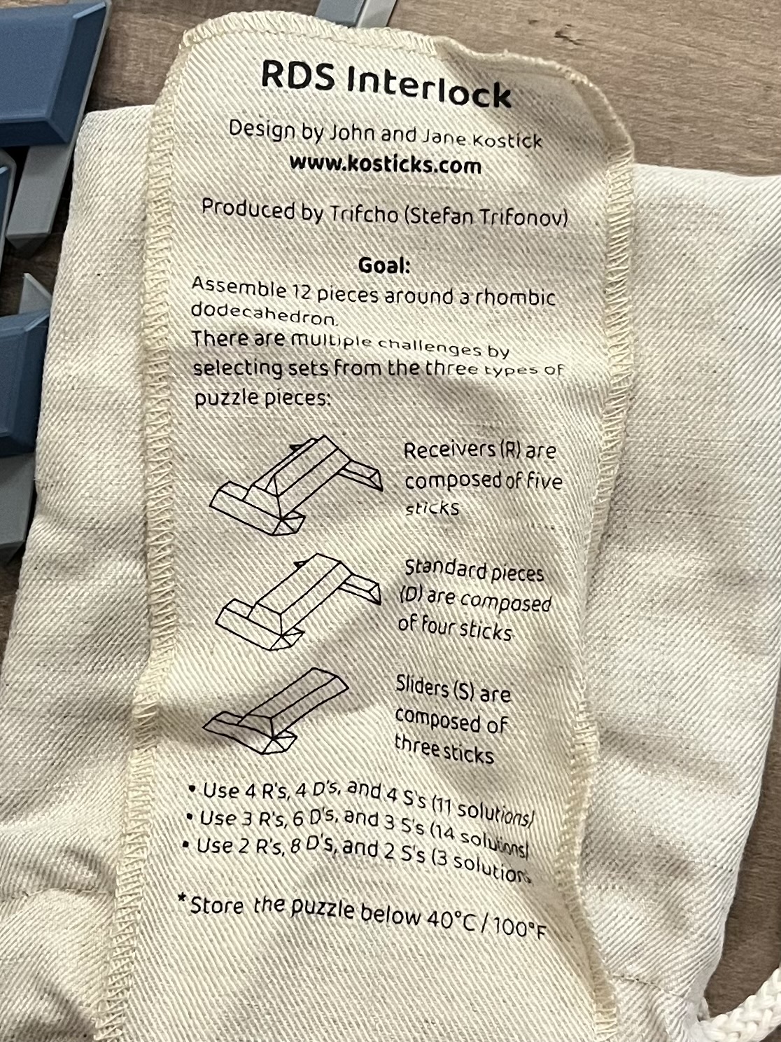 RDS Interlock is an engaging interlocking puzzle designed by John and Jane Kostick (kosticks.com). With its geometric finesse and aesthetic appeal, this multi-challenge puzzle invites enthusiasts to explore different configurations using its distinct puzzle pieces.