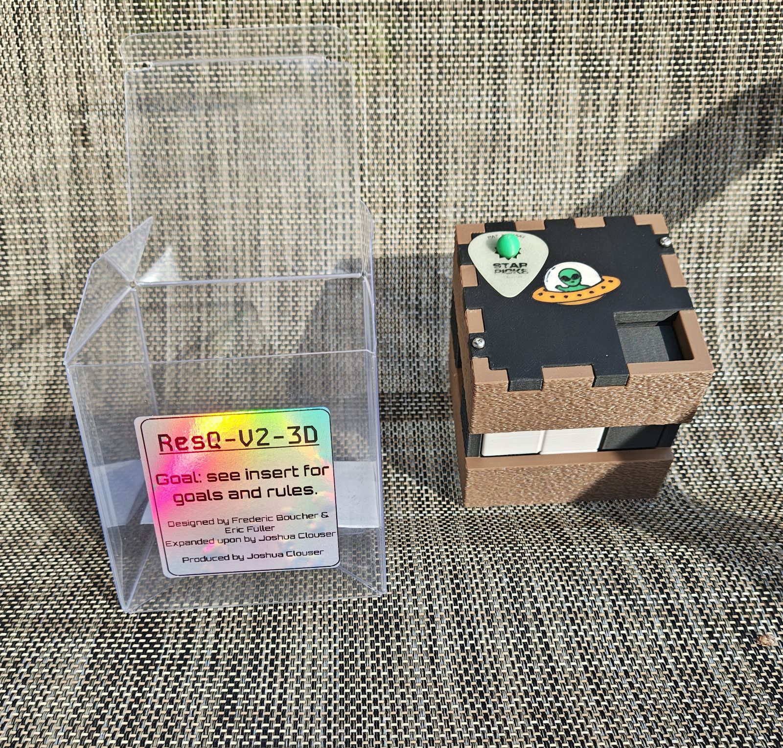 ResQ-V2-3D is a sequential discovery puzzle designed by Frederic Boucher and Eric Fuller expanded upon and reproduced by Joshua Clouser at PGHPuzzles, fall of 2025.